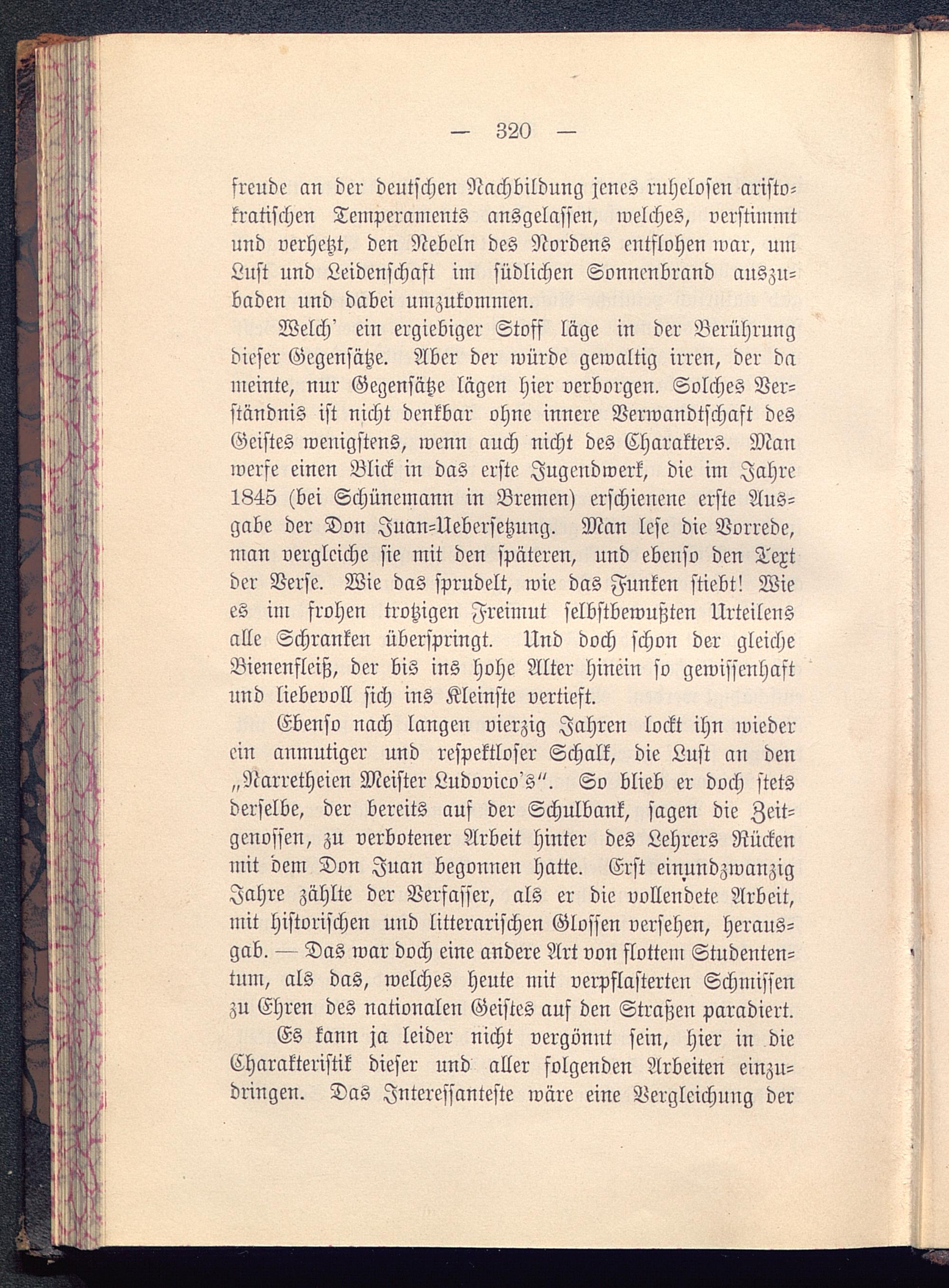 Welch' ein ergiebiger Stoff läge in der Berührungdieser Gegensätze. Aber der würde gewaltig irren, der dameinte, nur Gegensätze lägen hier verborgen. Solches Ver-ständnis ist nicht denkbar ohne innere Verwandtschaft desGeistes wenigstens, wenn auch nicht des Charakters. Manwerfe einen Blick in das erste Jugeudwerk, die im Jahre1845 (bei Schünemann in Bremen ) erschienene erste Aus-gabe der Don Juan-Uebersetzung. Man lese die Vorrede,man vergleiche sie mit den späteren, und ebenso den Textder Verse. Wie das sprudelt, wie das Funken stiebt! Wiees im frohen trotzigen Freimut selbstbewußten Urteileusalle Schranken überspringt. Und doch schon der gleicheBienenfleiß, der bis ins hohe Alter hinein so gewissenhastund liebevoll sich ins Kleinste vertieft.