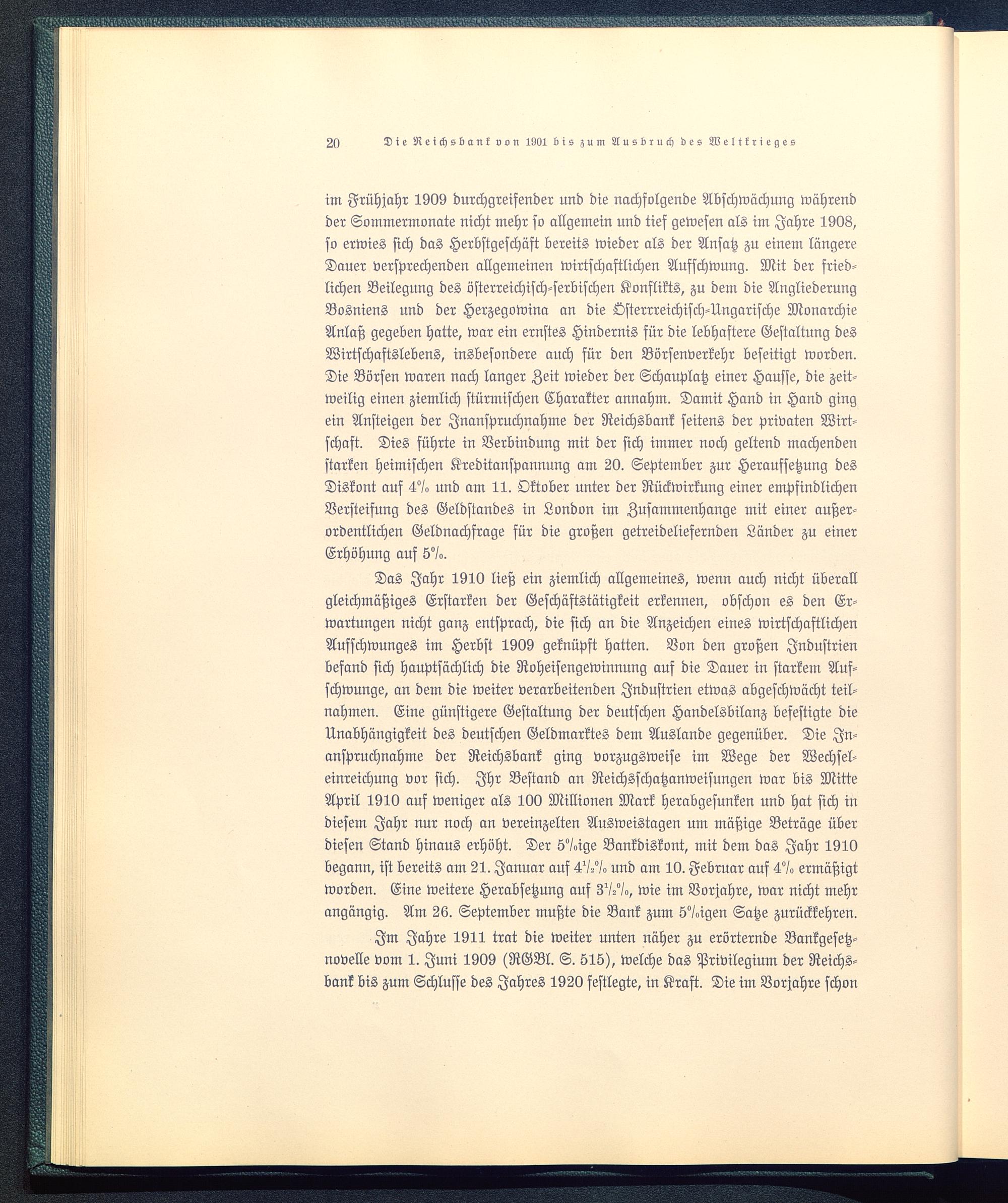 Im Jahre 1911 trat die weiter unten näher zu erörternde Bankgesetz-novelle vom 1. Juni 1909 (RGBl. S. 515), welche das Privilegium der Reichs-bank bis zum Schlüsse des Jahres 1920 festlegte, in Kraft. Die im Vorjahre schon