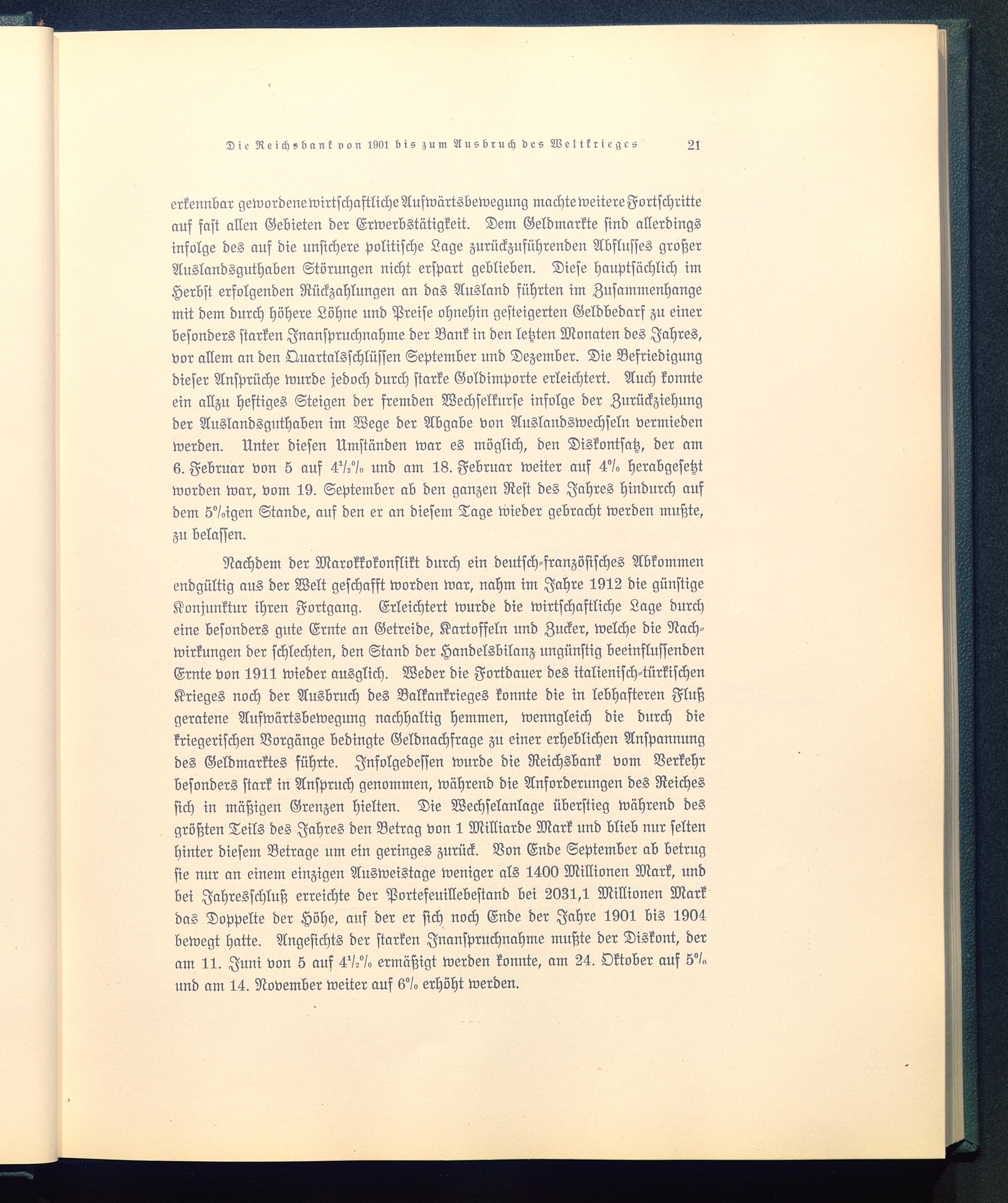 Nachdem der Marokkokonflikt durch ein deutsch -französisches Abkommenendgültig aus der Welt geschafft worden war, nahm im Jahre 1912 die günstigeKonjunktur ihren Fortgang. Erleichtert wurde die wirtschaftliche Lage durcheine besonders gute Ernte an Getreide, Kartoffeln und Zucker, welche die Nach-wirkungen der schlechten, den Stand der Handelsbilanz ungünstig beeinflussendenErnte von 1911 wieder ausglich. Weder die Fortdauer des italienisch-türkischenKrieges noch der Ausbruch des Balkankrieges konnte die in lebhafteren Flußgeratene Aufwärtsbewegung nachhaltig hemmen, wenngleich die durch diekriegerischen Vorgänge bedingte Geldnachfrage zu einer erheblichen Anspannungdes Geldmarktes führte. Infolgedessen wurde die Reichsbank vom Verkehrbesonders stark in Anspruch genommen, während die Anforderungen des Reichessich in mäßigen Grenzen hielten. Die Wechselanlage überstieg während desgrößten Teils des Jahres den Betrag von 1 Milliarde Mark und blieb nur seltenhinter diesem Betrage um ein geringes zurück. Von Ende September ab betrugsie nur an einem einzigen Ausweistage weniger als 1400 Millionen Mark, undbei Jahresschluß erreichte der Portefeuillebestand bei 2031,1 Millionen Markdas Doppelte der Höhe, auf der er sich noch Ende der Jahre 1901 bis 1904bewegt hatte. Angesichts der starken Inanspruchnahme mußte der Diskont, deram 11. Juni von 5 auf 4'/2°/° ermäßigt werden konnte, am 24. Oktober auf 5°/»und am 14. November weiter auf 6°/° erhöht werden.