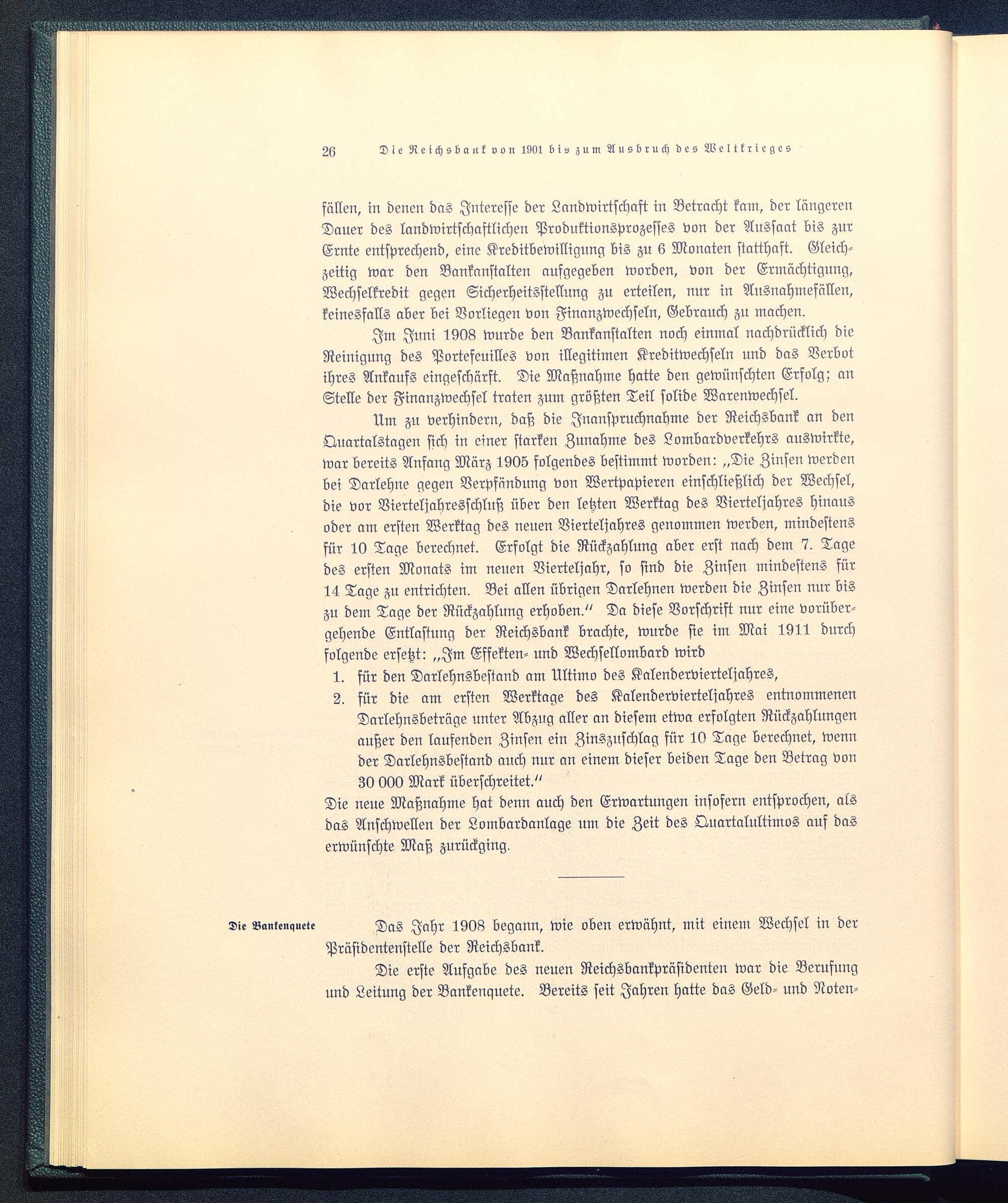 Um zu verhindern, daß die Inanspruchnahme der Reichsbank an denQuartalstagen sich in einer starken Zunahme des Lombardverkehrs auswirkte,war bereits Anfang März 1905 folgendes bestimmt worden: „Die Zinsen werdenbei Darlehne gegen Verpfändung von Wertpapieren einschließlich der Wechsel,die vor Vierteljahresschluß über den letzten Werktag des Vierteljahres hinausoder am ersten Werktag des neuen Vierteljahres genommen werden, mindestensfür 10 Tage berechnet. Erfolgt die Rückzahlung aber erst nach dem 7. Tagedes ersten Monats im neuen Vierteljahr, so sind die Zinsen mindestens für14 Tage zu entrichten. Bei allen übrigen Darlehnen werden die Zinsen nur biszu dem Tage der Rückzahlung erhoben." Da diese Vorschrift nur eine vorüber-gehende Entlastung der Reichsbank brachte, wurde sie im Mai 1911 durchfolgende ersetzt: „Im Effekten- und Wechsellombard wird