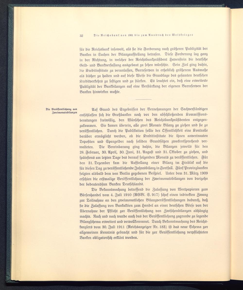 Die Bekanntmachung betreffend die Zulassung von Wertpapieren zumBörsenhandel vom 4. Juli 1910 (RGBl. S. 917) schuf einen indirekten Zwangzur Teilnahme an den zweimonatlichen Bilanzveröffentlichungen dadurch, daßsie die Zulassung von Bankaktien zum Handel an einer deutschen Börse von derÜbernahme der Pflicht zur Veröffentlichung von Zwischenbilanzen abhängigmachte. Nach und nach wurde auch das der Veröffentlichung zugrunde zu legendeBilanzschema erweitert und vervollkommnet. Durch Bekanntmachung des Reichs-kanzlers vom 30. Juli 1911 (Reichsanzeiger Nr. 183) ist das neue Schema zurallgemeinen Kenntnis gebracht und für die zur Veröffentlichung verpflichtetenBanken obligatorisch erklärt worden.
