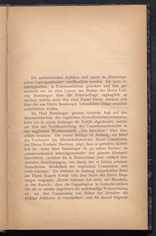 Da Herr Bamberger grosses Gewicht legt auf denMehrheitsbericht der englischen Gewerkvereinscommission,habe ich in einem Anhänge die Kritik abgedruckt, welchezur Zeit der Veröffentlichung des Commissionsberichts inder englischen "Wochenschrift „The Spectator “ über den-selben erschien. Die zweite Beilage im Anhang, ein Briefdes Verfassers des Minderheitsberichts dieser Commissiondes Herrn Frederic Iiarrison, zeigt, dass es geradezu lächer-lich ist, wenn Herr Bamberger (S. 344 seines Buches) als„ausserordentlich beherzigenswerth“ den „ganzen Abstand“hervorhebt, „welcher die in Deutschland jetzt vielfach kur-sirenden Anschauungen, von denen der so höchst arbeiter-freundlichen Minderheit der englischen Commission totocoelo scheidet.“ Ein weiterer im Anhang mitgetheilter Briefdes Herrn Rupert Kettle tritt dem Satze des Herrn Bam-berger entgegen: „Kettle bekennt sich nicht, wie Mundella,zu der Ansicht, dass die Organisation in Gewerkvereinen(für die er minder begeistert ist) nothwendige Voraussetzungsei, um dem Compromiss von Seiten der Arbeiter dienöthige Adhäsion zu verschaffen“, und die darauf folgende