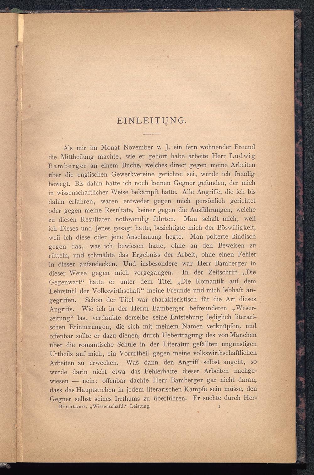 Als mir im Monat November v. J. ein fern wohnender Freunddie Mittheilung machte, wie er gehört habe arbeite Herr LudwigBamberger an einem Buche, welches direct gegen meine Arbeitenüber die englischen Gewerkvereine gerichtet sei, wurde ich freudigbewegt. Bis dahin hatte ich noch keinen Gegner gefunden, der michin wissenschaftlicher Weise bekämpft hätte. Alle Angriffe, die ich bisdahin erfahren, waren entweder gegen mich persönlich gerichtetoder gegen meine Resultate, keiner gegen die Ausführungen, welchezu diesen Resultaten nothwendig führten. Man schalt mich, weilich Dieses und Jenes gesagt hatte, bezichtigte mich der Böswilligkeit,weil ich diese oder jene Anschauung hegte. Man polterte kindischgegen das, was ich bewiesen hatte, ohne an den Beweisen zurütteln, und schmähte das Ergebniss der Arbeit, ohne einen Fehlerin dieser aufzudecken. Und insbesondere war Herr Bamberger indieser Weise gegen mich vorgegangen. In der Zeitschrift „DieGegenwart“ hatte er unter dem Titel „Die Romantik auf demLehrstuhl der Volkswirthschaft“ meine Freunde und mich lebhaft an-gegriffen. Schon der Titel war charakteristisch für die Art diesesAngriffs. Wie ich in der Herrn Bamberger befreundeten „Weser-zeitung“ las, verdankte derselbe seine Entstehung lediglich literari-schen Erinnerungen, die sich mit meinem Namen verknüpfen, undoffenbar sollte er dazu dienen, durch Uebertragung des von Manchenüber die romantische Schule in der Literatur gefällten ungünstigenUrtheils auf mich, ein Vorurtheil gegen meine volkswirthschaftlichenArbeiten zu erwecken. Was dann den Angriff ■ selbst angeht, sowurde darin nicht etwa das Fehlerhafte dieser Arbeiten nachge-wiesen — nein: offenbar dachte Herr Bamberger gar nicht daran,dass das Hauptstreben in jedem literarischen Kampfe sein müsse, denGegner selbst seines Irrthums zu überführen. Er suchte durch Her-