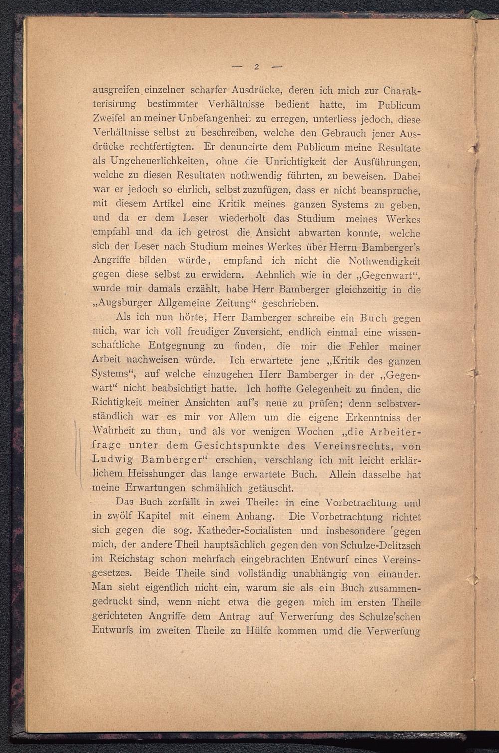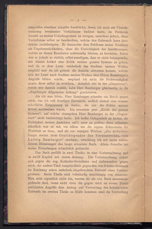 Das Buch zerfällt in zwei Theile: in eine Vorbetrachtung undin zwölf Kapitel mit einem Anhang. Die Vorbetrachtung richtetsich gegen die sog. Katheder-Socialisten und insbesondere 'gegenmich, der andere Theil hauptsächlich gegen den von Schulze-Delitzsch im Reichstag schon mehrfach eingebrachten Entwurf eines Vereins-gesetzes. Beide Theile sind vollständig unabhängig von einander.Man sieht eigentlich nicht ein, warum sie als ein Buch zusammen-gedruckt sind, wenn nicht etwa die gegen mich im ersten Theilegerichteten Angriffe dem Antrag auf Verwerfung des Schulze’schenEntwurfs im zweiten Theile zu Hülfe kommen umd die Verwerfung