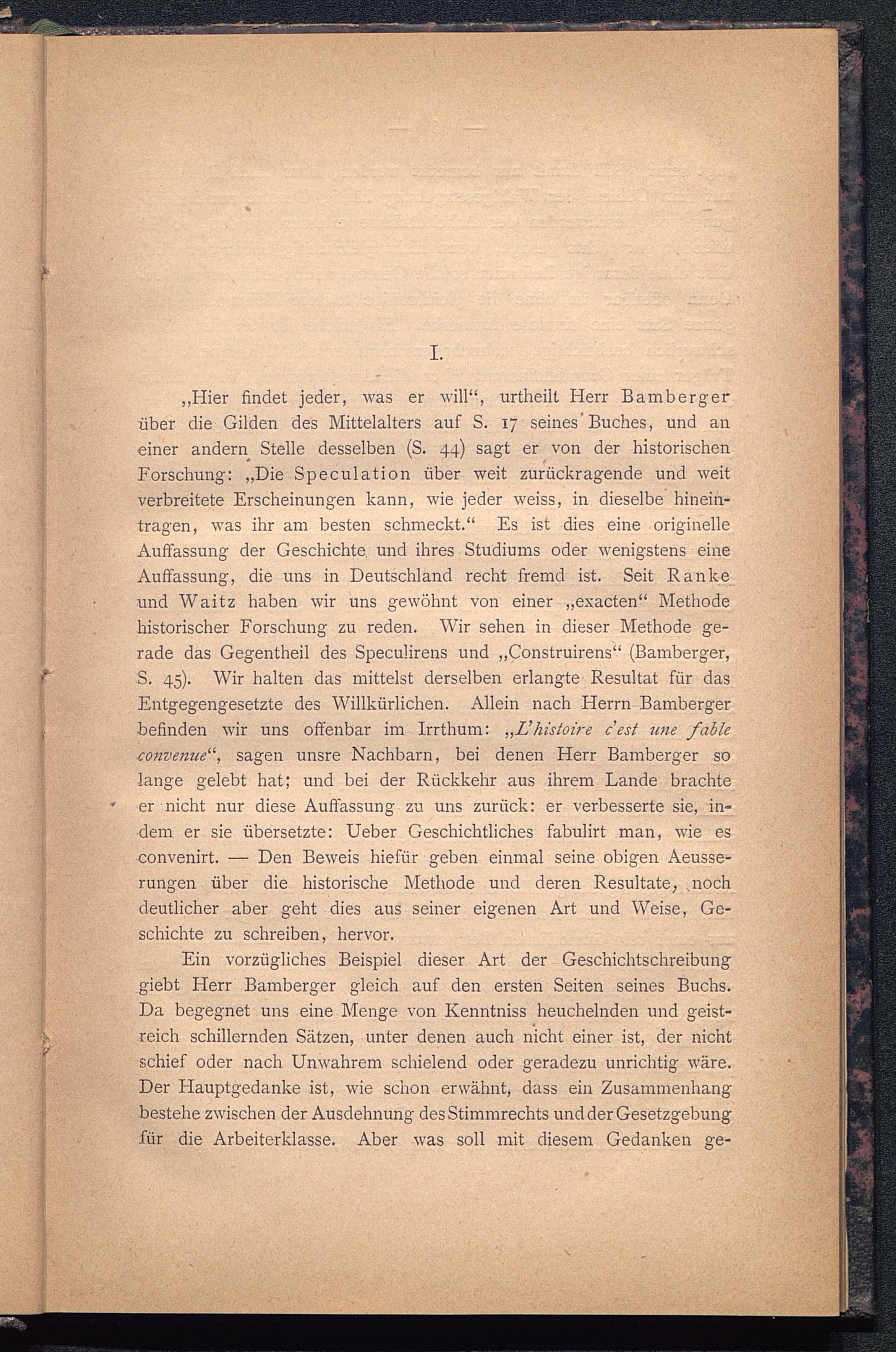 „Hier findet jeder, was er will“, urtheilt Herr Bambergerüber die Gilden des Mittelalters auf S. 17 seines’Buches, und aneiner andern Stelle desselben (S. 44) sagt er von der historischenForschung: „Die Speculation über weit zurückragende und weitverbreitete Erscheinungen kann, wie jeder weiss, in dieselbe hinein-tragen, was ihr am besten schmeckt.“ Es ist dies eine originelleAuffassung der Geschichte, und ihres Studiums oder wenigstens eineAuffassung, die uns in Deutschland recht fremd ist. Seit Rankeund Waitz haben wir uns gewöhnt von einer „exacten“ Methodehistorischer Forschung zu reden. Wir sehen in dieser Methode ge-rade das Gegentheil des Specuürens und „Construirens“ (Bamberger,S. 45). Wir halten das mittelst derselben erlangte Resultat für dasEntgegengesetzte des Willkürlichen. Allein nach Herrn Bambergerbefinden wir uns offenbar im Irrthum: „L’histoire c est une fableconvemie sagen unsre Nachbarn, bei denen Herr Bamberger solange gelebt hat; und bei der Rückkehr aus ihrem Lande brachte• er nicht nur diese Auffassung zu uns zurück: er verbesserte sie, in-dem er sie übersetzte: Ueber Geschichtliches fabulirt man, wie esconvenirt. — Den Beweis hiefiir geben einmal seine obigen Aeusse-rungen über die historische Methode und deren Resultate; .nochdeutlicher aber geht dies aus seiner eigenen Art und Weise, Ge-schichte zu schreiben, hervor.