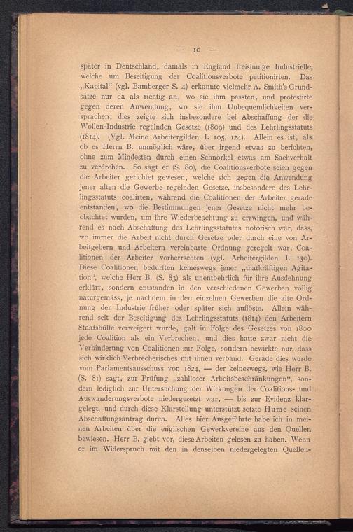 später in Deutschland, damals in England freisinnige Industrielle,welche um Beseitigung der Coalitionsverbote petitionirten. Das„Kapital“ (vgl. Bamberger S. 4) erkannte vielmehr A. Smith’s Grund-sätze nur da als richtig an, wo sie ihm passten, und protestirtegegen deren Anwendung, wo sie ihm Unbequemlichkeiten ver-sprachen; dies zeigte sich insbesondere bei Abschaffung der dieWollen-Industrie regelnden Gesetze (1809) und des Lehrlingsstatuts(1814). (Vgl. Meine Arbeitergilden I. 105, 124). Allein es ist, alsob es Herrn B. unmöglich wäre, über irgend etwas zu berichten,ohne zum Mindesten durch einen Schnörkel etwas am Sachverhaltzu verdrehen. So sagt er (S. 80), die Coalitionsverbote seien gegendie Arbeiter gerichtet gewesen, welche sich gegen die Anwendungjener alten die Gewerbe regelnden Gesetze, insbesondere des Lehr-lingsstatuts coalirten, während die Coalitionen der Arbeiter geradeentstanden, wo die Bestimmungen jener Gesetze nicht mehr be-obachtet wurden, um ihre Wiederbeachtung zu erzwingen, und wäh-rend es nach Abschaffung des Lehrlingsstatutes notorisch war, dass,wo immer die Arbeit nicht durch Gesetze oder durch eine von Ar-beitgebern und Arbeitern vereinbarte Ordnung geregelt war, Coa-litionen der Arbeiter vorherrschten (vgl. Arbeitergilden I. 130).Diese Coalitionen bedurften keineswegs jener „thatkräftigen Agita-tion“, welche Herr B. (S. 83) als unentbehrlich für ihre Ausdehnungerklärt, sondern entstanden in den verschiedenen Gewerben völlignaturgemäss, je nachdem in den einzelnen Gewerben die alte Ord-nung der Industrie früher oder später sich auflöste. Allein wäh-rend seit der Beseitigung des Lehrlingsstatuts (1814) den ArbeiternStaatshülfe verweigert wurde, galt in Folge des Gesetzes von 1800jede Coalition als ein Verbrechen, und dies hatte zwar nicht dieVerhinderung von Coalitionen zur Folge, sondern bewirkte nur, dasssich wirklich Verbrecherisches mit ihnen verband. Gerade dies wurde-vom Parlamentsausschuss von 1824, — der keineswegs, wie Herr B.(S. 81) sagt, zur Prüfung „zahlloser Arbeitsbeschränkungen“, son-dern lediglich zur Untersuchung der Wirkungen der Coalitions- undAuswanderungsverbote niedergesetzt war, — bis zur Evidenz klar-gelegt, und durch diese Klarstellung unterstützt setzte Hume seinenAbschaffungsantrag durch. Alles hier Ausgeführte habe ich in mei-nen Arbeiten über die englischen Gewerkvereine aus den Quellenbewiesen. Herr B. giebt vor, diese Arbeiten gelesen zu haben. Wenner im Widerspruch mit den in denselben niedergelegten Quellen-