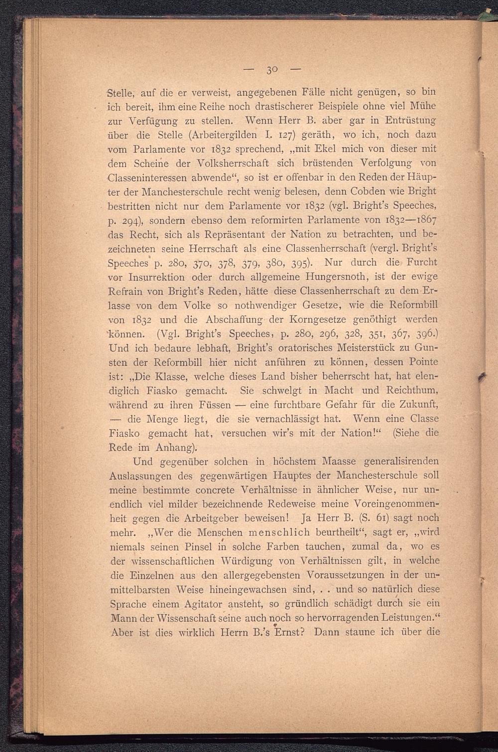 Stelle, auf die er verweist, angegebenen Fälle nicht genügen, so binich bereit, ihm eine Reihe noch drastischerer Beispiele ohne viel Mühezur Verfügung zu stellen. Wenn Herr B. aber gar in Entrüstungüber die Stelle (Arbeitergilden I. 127) geräth, wo ich, noch dazuvom Parlamente vor 1832 sprechend, „mit Ekel mich von dieser mitdem Scheine der Volksherrschaft sich brüstenden Verfolgung vonClasseninteressen abwende“, so ist er offenbar in den Reden der Häup-ter der Manchesterschule recht wenig belesen, denn Cobden wie Brightbestritten nicht nur dem Parlamente vor 1832 (vgl. Bright’s Speeches,p. 294), sondern ebenso dem reformirten Parlamente von 1832—1867das Recht, sich als Repräsentant der Nation zu betrachten, und be-zeichneten seine Herrschaft als eine Classenherrschaft (vergl. Bright’sSpeeches p. 280, 370, 378, 379, 380, 395). Nur durch die Furchtvor Insurrektion oder durch allgemeine Hungersnoth, ist der ewigeRefrain von Bright’s Reden, hätte diese Classenherrschaft zu dem Er-lasse von dem Volke so nothwendiger Gesetze, wie die Reformbillvon 1832 und die Abschaffung der Korngesetze genöthigt werden'können. (Vgl. Bright’s Speeches, p. 280, 296, 328, 351, 367, 396.)Und ich bedaure lebhaft, Bright’s oratorisches Meisterstück zu Gun-sten der Reformbill hier nicht anführen zu können, dessen Pointeist: „Die Klasse, welche dieses Land bisher beherrscht hat, hat elen-diglich Fiasko gemacht. Sie schwelgt in Macht und Reichthum,während zu ihren Füssen — eine furchtbare Gefahr für die Zukunft,— die Menge liegt, die sie vernachlässigt hat. Wenn eine ClasseFiasko gemacht hat, versuchen wir’s mit der Nation!“ (Siehe dieRede im Anhang).