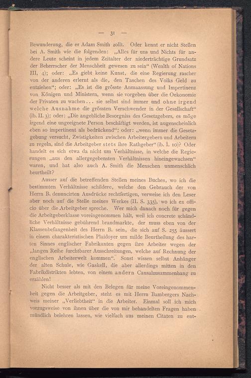 Nicht besser als mit den Belegen für meine Voreingenommen-heit gegen die Arbeitgeber, steht es mit Herrn Bambergers Nach-weis meiner „Verliebtheit“ in die Arbeiter. Einmal soll ich michvorzugsweise von ihnen über die von mir behandelten Fragen habenmündlich belehren lassen, wie vielfach aus meinen Citaten zu ent-
