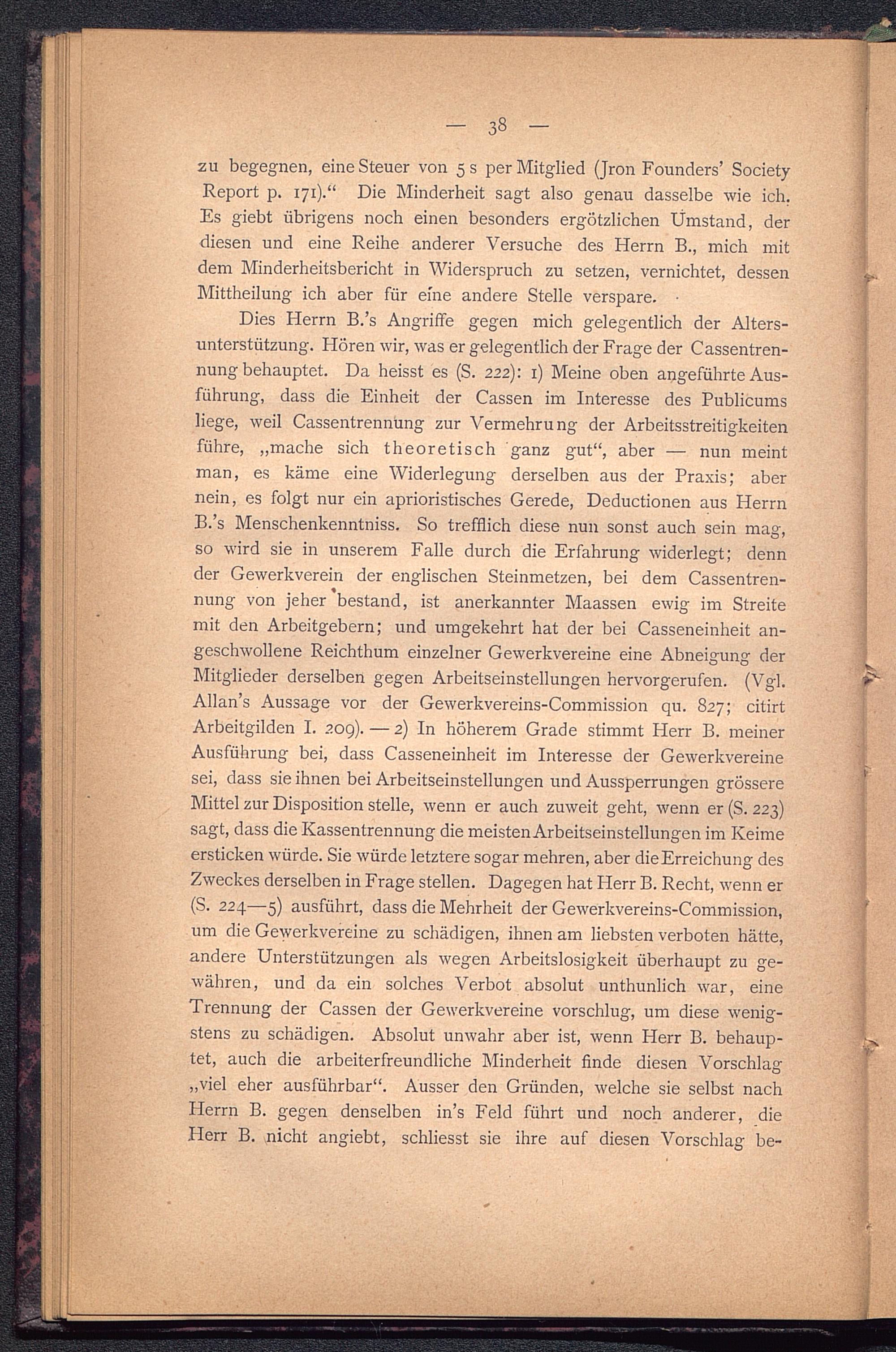 Dies Herrn B.’s Angriffe gegen mich gelegentlich der Alters-unterstützung. Hören wir, was er gelegentlich der Frage der Cassentren-nung behauptet. Da heisst es (S. 222): 1) Meine oben angeführte Aus-führung, dass die Einheit der Cassen im Interesse des Publicumsliege, weil Cassentrennung zur Vermehrung der Arbeitsstreitigkeitenführe, „mache sich theoretisch ganz gut“, aber — nun meintman, es käme eine Widerlegung derselben aus der Praxis; abernein, es folgt nur ein aprioristisches Gerede, Deductionen aus HerrnB.’s Menschenkenntniss. So trefflich diese nun sonst auch sein mag,so wird sie in unserem Falle durch die Erfahrung widerlegt; dennder Gewerkverein der englischen Steinmetzen, bei dem Cassentren-nung von jeher bestand, ist anerkannter Maassen ewig im Streitemit den Arbeitgebern; und umgekehrt hat der bei Casseneinheit an-geschwollene Reichthum einzelner Gewerkvereine eine Abneigung derMitglieder derselben gegen Arbeitseinstellungen hervorgerufen. (Vgl.Allan’s Aussage vor der Gewerkvereins-Commission qu. 827; citirtArbeitgilden I. 209). — 2) In höherem Grade stimmt Herr B. meinerAusführung bei, dass Casseneinheit im Interesse der Gewerkvereinesei, dass sie ihnen bei Arbeitseinstellungen und Aussperrungen grössereMittel zur Disposition stelle, wenn er auch zuweit geht, wenn er (S. 223)sagt, dass die Rassentrennung die meisten Arbeitseinstellungen im Keimeersticken würde. Sie würde letztere sogar mehren, aber dieErreichung desZweckes derselben in Frage stellen. Dagegen hat Flerr B. Recht, wenn er(S. 224—5) ausführt, dass die Mehrheit der Gewerkvereins-Commission,um die Gewerkvereine zu schädigen, ihnen am liebsten verboten hätte,andere Unterstützungen als wegen Arbeitslosigkeit überhaupt zu ge-währen, und da ein solches Verbot absolut unthunlich war, eineTrennung der Cassen der Gewerkvereine vorschlug, um diese wenig-stens zu schädigen. Absolut unwahr aber ist, wenn Herr B. behaup-tet, auch die arbeiterfreundliche Minderheit finde diesen Vorschlag„viel eher ausführbar“. Ausser den Gründen, welche sie selbst nachHerrn B. gegen denselben in’s Feld führt und noch anderer, dieHerr B. nicht angiebt, schliesst sie ihre auf diesen Vorschlag be-