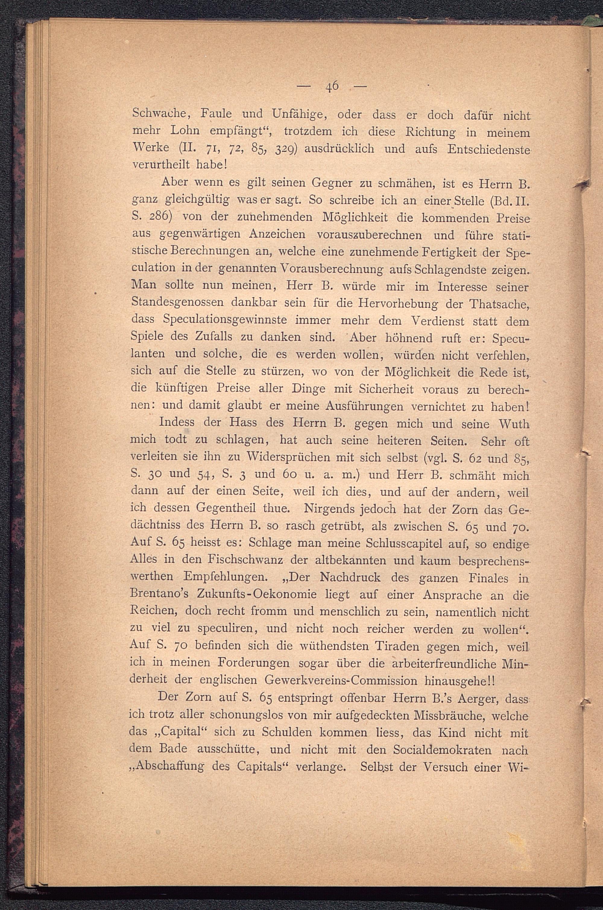 Indess der Hass des Herrn B. gegen mich und seine Wuthmich todt zu schlagen, hat auch seine heiteren Seiten. Sehr oftverleiten sie ihn zu Widersprüchen mit sich selbst (vgl. S. 62 und 85,S. 30 und 54, S. 3 und 60 u. a. m.) und Herr B. schmäht michdann auf der einen Seite, weil ich dies, und auf der andern, weilich dessen Gegentheil thue. Nirgends jedoch hat der Zorn das Ge-dächtniss des Herrn B. so rasch getrübt, als zwischen S. 65 und 70.Auf S. 65 heisst es: Schlage man meine Schlusscapitel auf, so endigeAlles in den Fischschwanz der altbekannten und kaum besprechens-werthen Empfehlungen. „Der Nachdruck des ganzen Finales inBrentano’s Zukunfts-Oekonomie liegt auf einer Ansprache an dieReichen, doch recht fromm und menschlich zu sein, namentlich nichtzu viel zu speculiren, und nicht noch reicher werden zu wollen“.Auf S. 70 befinden sich die wüthendsten Tiraden gegen mich, weilich in meinen Forderungen sogar über die arbeiterfreundliche Min-derheit der englischen Gewerkvereins-Commission hinausgehe!!