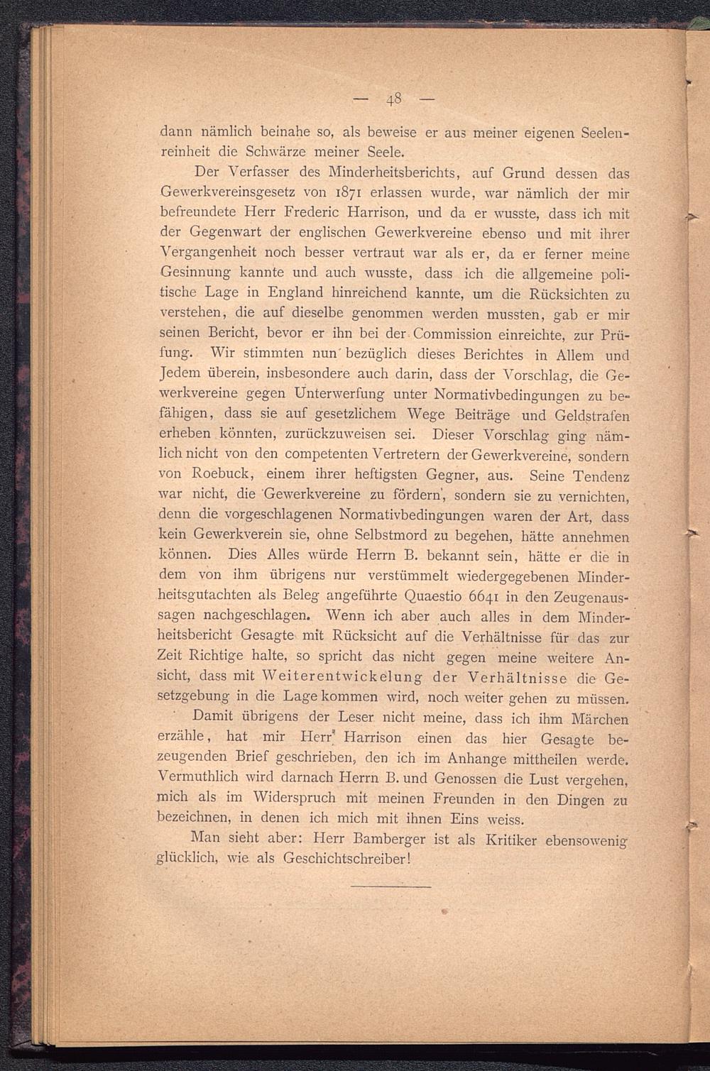 Der Verfasser des Minderheitsberichts, auf Grund dessen dasGewerkvereinsgesetz von 1871 erlassen wurde, war nämlich der mirbefreundete Herr Frederic Harrison , und da er wusste, dass ich mitder Gegenwart der englischen Gewerkvereine ebenso und mit ihrerVergangenheit noch besser vertraut war als er, da er ferner meineGesinnung kannte und auch wusste, dass ich die allgemeine poli-tische Lage in England hinreichend kannte, um die Rücksichten zuverstehen, die auf dieselbe genommen werden mussten, gab er mirseinen Bericht, bevor er ihn bei der Commission einreichte, zur Prü-fung. Wir stimmten nun' bezüglich dieses Berichtes in Allem undJedem überein, insbesondere auch darin, dass der Vorschlag, die Ge-werkvereine gegen Unterwerfung unter Normativbedingungen zu be-fähigen, dass sie auf gesetzlichem Wege Beiträge und Geldstrafenerheben könnten, zurückzuweisen sei. Dieser Vorschlag ging näm-lich nicht von den competenten Vertretern der Gewerkvereine, sondernvon Roebuck, einem ihrer heftigsten Gegner, aus. Seine Tendenzwar nicht, die 'Gewerkvereine zu fördern', sondern sie zu vernichten,denn die vorgeschlagenen Normativbedingungen waren der Art, dasskein Gewerkverein sie, ohne Selbstmord zu begehen, hätte annehmenkönnen. Dies Alles würde Herrn B. bekannt sein, hätte er die indem von ihm übrigens nur verstümmelt wiedergegebenen Minder-heitsgutachten als Beleg angeführte Quaestio 6641 in den Zeugenaus-sagen nachgeschlagen. Wenn ich aber auch alles in dem Minder-heitsbericht Gesagte mit Rücksicht auf die Verhältnisse für das zurZeit Richtige halte, so spricht das nicht gegen meine weitere An-sicht, dass mit Weiterentwickelung der Verhältnisse die Ge-setzgebung in die Lage kommen wird, noch weiter gehen zu müssen.