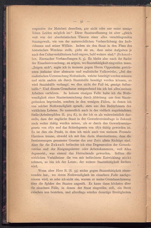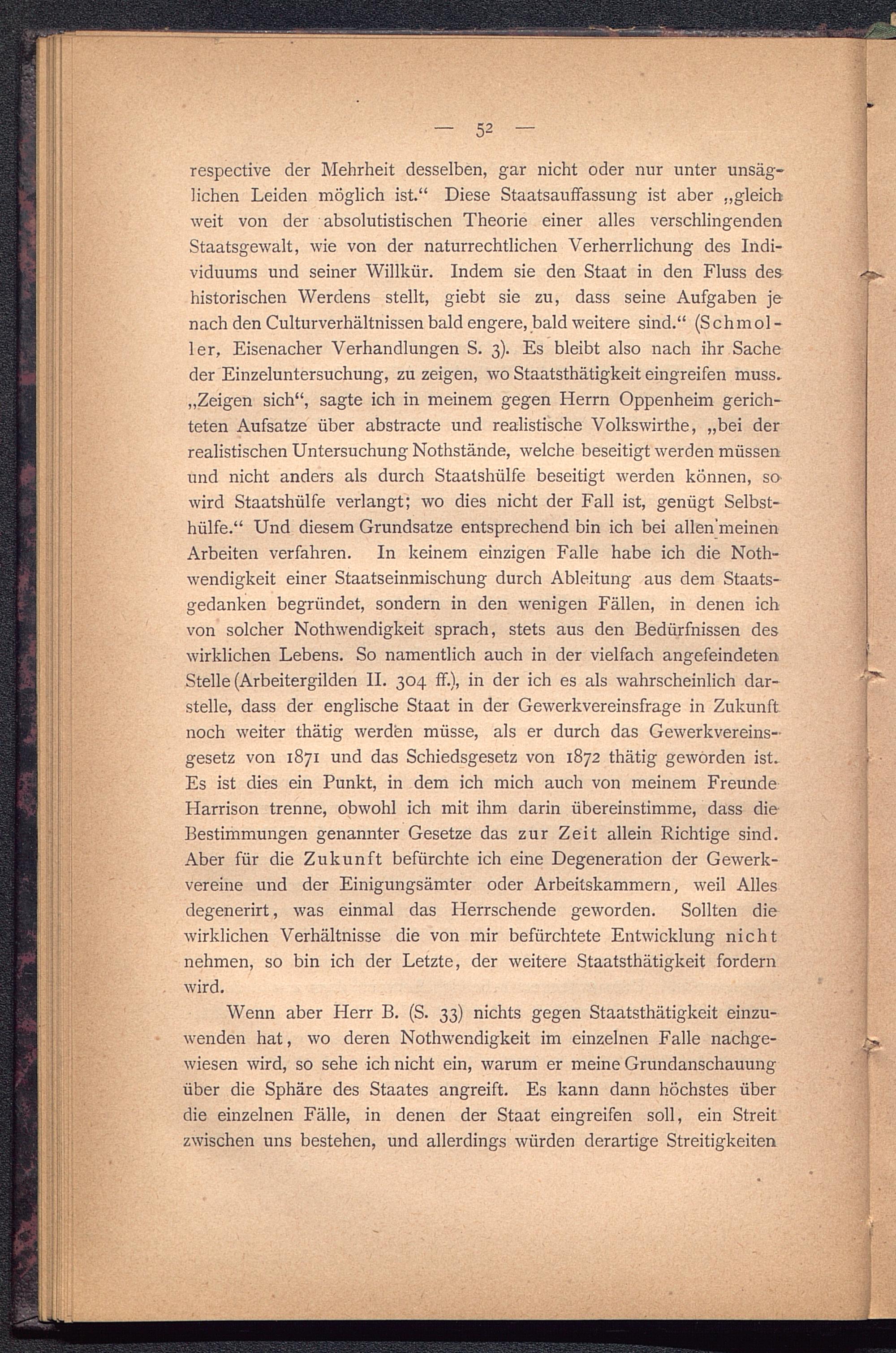 respective der Mehrheit desselben, gar nicht oder nur unter unsäg-lichen Leiden möglich ist.“ Diese Staatsauffassung ist aber „gleichweit von der absolutistischen Theorie einer alles verschlingendenStaatsgewalt, wie von der naturrechtlichen Verherrlichung des Indi-viduums und seiner Willkür. Indem sie den Staat in den Fluss des-historischen Werdens stellt, giebt sie zu, dass seine Aufgaben jenach den Culturverhältnissen bald engere, bald weitere sind.“ (Schmol -ler, Eisenacher Verhandlungen S. 3). Es bleibt also nach ihr Sacheder Einzeluntersuchung, zu zeigen, wo Staatsthätigkeit eingreifen muss.„Zeigen sich“, sagte ich in meinem gegen Herrn Oppenheim gerich-teten Aufsatze über abstracte und realistische Volkswirthe, „bei derrealistischen Untersuchung Nothstände, welche beseitigt werden müssenund nicht anders als durch Staatshülfe beseitigt werden können, so-wird Staatshülfe verlangt; wo dies nicht der Fall ist, genügt Selbst-hülfe.“ Und diesem Grundsätze entsprechend bin ich bei allen’meinenArbeiten verfahren. In keinem einzigen Falle habe ich die Noth-wendigkeit einer Staatseinmischung durch Ableitung aus dem Staats-gedanken begründet, sondern in den wenigen Fällen, in denen ichvon solcher Nothwendigkeit sprach, stets aus den Bedürfnissen deswirklichen Lebens. So namentlich auch in der vielfach angefeindetenStelle (Arbeitergilden II. 304 ff.), in der ich es als wahrscheinlich dar-stelle, dass der englische Staat in der Gewerkvereinsfrage in Zukunftnoch weiter thätig werden müsse, als er durch das Gewerkvereins-gesetz von 1871 und das Schiedsgesetz von 1872 thätig geworden ist.Es ist dies ein Punkt, in dem ich mich auch von meinem FreundeHarrison trenne, obwohl ich mit ihm darin übereinstimme, dass die-Bestimmungen genannter Gesetze das zur Zeit allein Richtige sind.Aber für die Zukunft befürchte ich eine Degeneration der Gewerk-vereine und der Einigungsämter oder Arbeitskammern, weil Allesdegenerirt, was einmal das Herrschende geworden. Sollten diewirklichen Verhältnisse die von mir befürchtete Entwicklung nichtnehmen, so bin ich der Letzte, der weitere Staatsthätigkeit fordernwird.