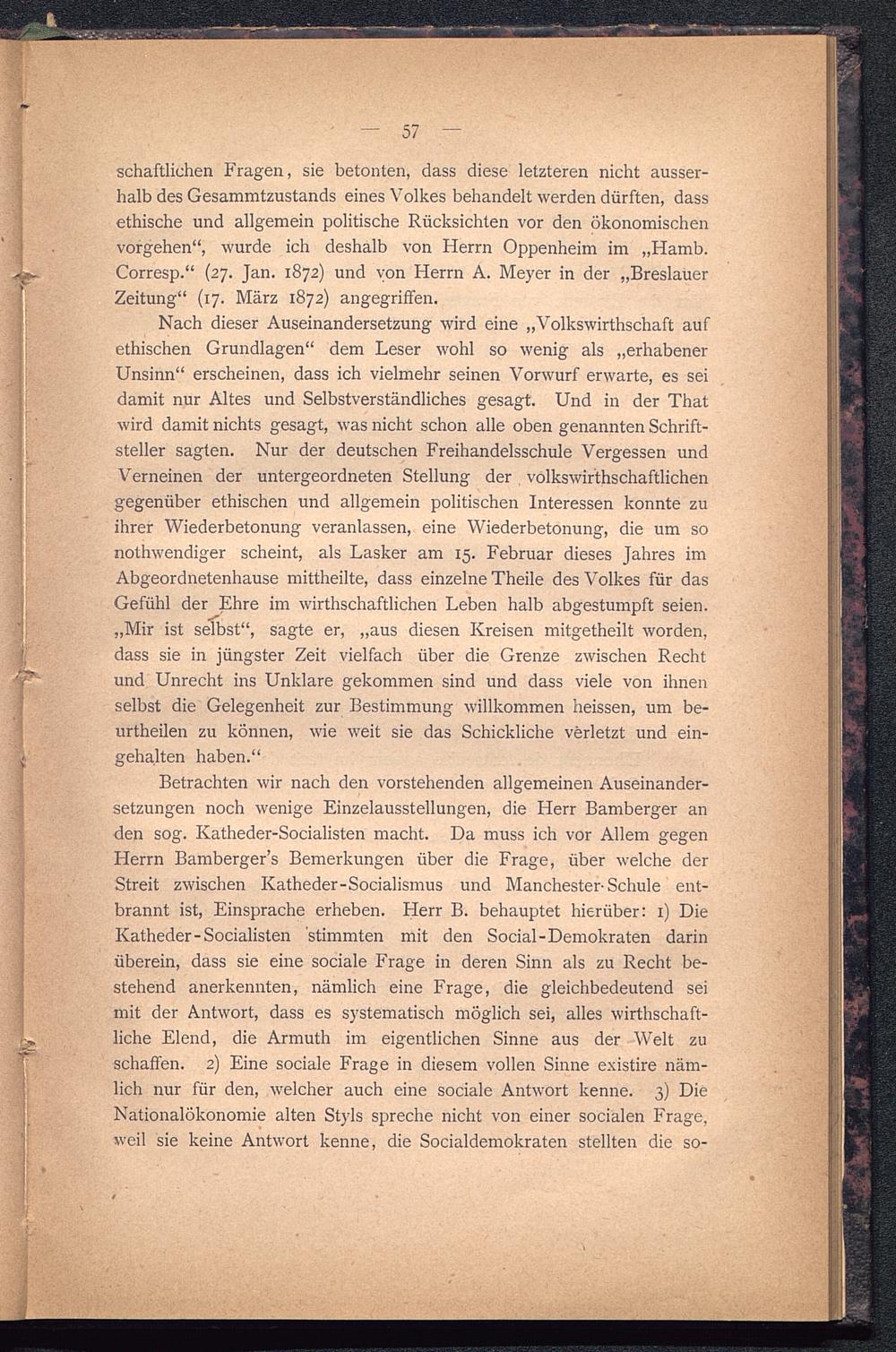 schaftlichen Fragen, sie betonten, dass diese letzteren nicht ausser-halb des Gesammtzustands eines Volkes behandelt werden dürften, dassethische und allgemein politische Rücksichten vor den ökonomischenvorgehen“, wurde ich deshalb von Herrn Oppenheim im „Hamb.Corresp.“ (27. Jan. 1872) und von Herrn A. Meyer in der „BreslauerZeitung“ (17. März 1872) angegriffen.