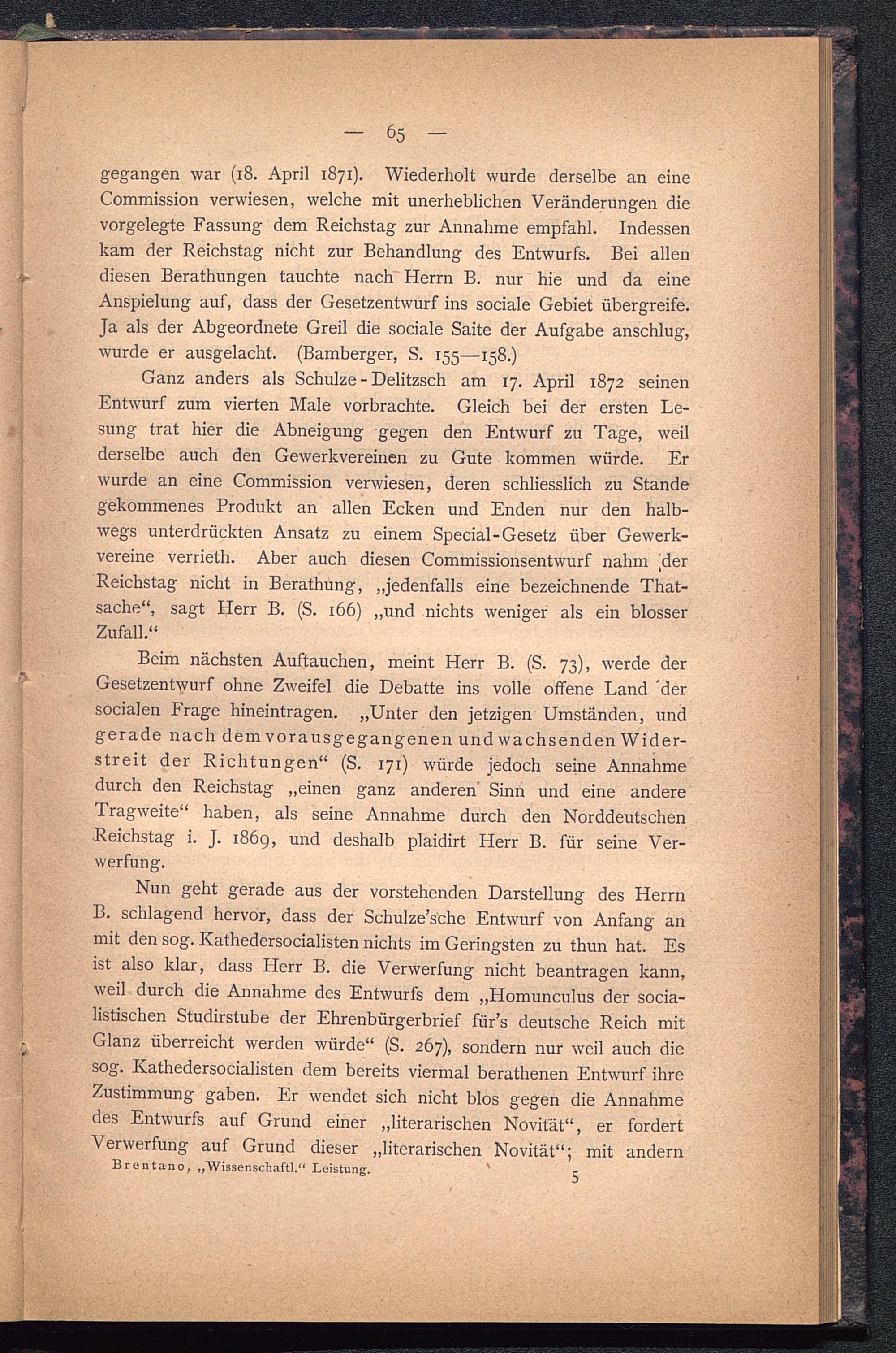 Nun geht gerade aus der vorstehenden Darstellung des HerrnB. schlagend hervor, dass der Schulze’sche Entwurf von Anfang anmit den sog. Kathedersocialisten nichts im Geringsten zu thun hat. Esist also klar, dass I-Ierr B. die Verwerfung nicht beantragen kann,weil durch die Annahme des Entwurfs dem „Homunculus der socia-listischen Studirstube der Ehrenbürgerbrief für’s deutsche Reich mitGlanz überreicht werden würde“ (S. 267), sondern nur weil auch diesog. Kathedersocialisten dem bereits viermal berathenen Entwurf ihreZustimmung gaben. Er wendet sich nicht blos gegen die Annahmedes Entwurfs auf Grund einer „literarischen Novität“, er fordertVerwerfung auf Grund dieser „literarischen Novität“; mit andern