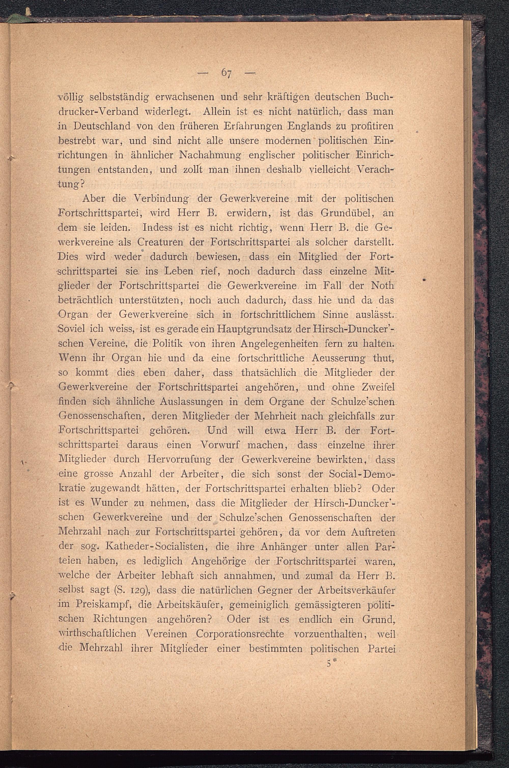 Aber die Verbindung der Gewerkvereine mit der politischenFortschrittspartei, wird Herr B. erwidern, ist das Grundübel, andem sie leiden. Indess ist es nicht richtig, wenn Herr B. die Ge-werkvereine als Creaturen der Fortschrittspartei als solcher darstellt.Dies wird weder dadurch bewiesen, dass ein Mitglied der Fort-schrittspartei sie ins Leben rief, noch dadurch dass einzelne Mit-glieder der Fortschrittspartei die Gewerkvereine im Fall der Nothbeträchtlich unterstützten, noch auch dadurch, dass hie und da dasOrgan der Gewerkvereine sich in fortschrittlichem Sinne auslässt.Soviel ich weiss, ist es gerade ein Hauptgrundsatz der Hirsch-Duncker’-schen Vereine, die Politik von ihren Angelegenheiten fern zu halten.Wenn ihr Organ hie und da eine fortschrittliche Aeusserung thut,so kommt dies eben daher, dass thatsächlich die Mitglieder derGewerkvereine der Fortschrittspartei angehören, und ohne Zweifelfinden sich ähnliche Auslassungen in dem Organe der Schulze’schenGenossenschaften, deren Mitglieder der Mehrheit nach gleichfalls zurFortschrittspartei gehören. Und will etwa Herr B. der Fort-schrittspartei daraus einen Vorwurf machen, dass einzelne ihrerMitglieder durch Hervorrufung der Gewerkvereine bewirkten, dasseine grosse Anzahl der Arbeiter, die sich sonst der Social-Demo-kratie zugewandt hätten, der Fortschrittspartei erhalten blieb? Oderist es Wunder zu nehmen, dass die Mitglieder der Hirsch-Duncker'-schen Gewerkvereine und der Schulze’schen Genossenschaften derMehrzahl nach zur Fortschrittspartei gehören, da vor dem Auftretender sog. Katheder-Socialisten, die ihre Anhänger unter allen Par-teien haben, es lediglich Angehörige der Fortschrittspartei waren,welche der Arbeiter lebhaft sich annahmen, und zumal da Herr B.selbst sagt (S. 129), dass die natürlichen Gegner der Arbeitsverkäuferim Preiskampf, die Arbeitskäufer, gemeiniglich, gemässigteren politi-schen Richtungen angehören? Oder ist es endlich ein Grund,wirthschaftlichen Vereinen Corporationsrechte vorzuenthalten, weil