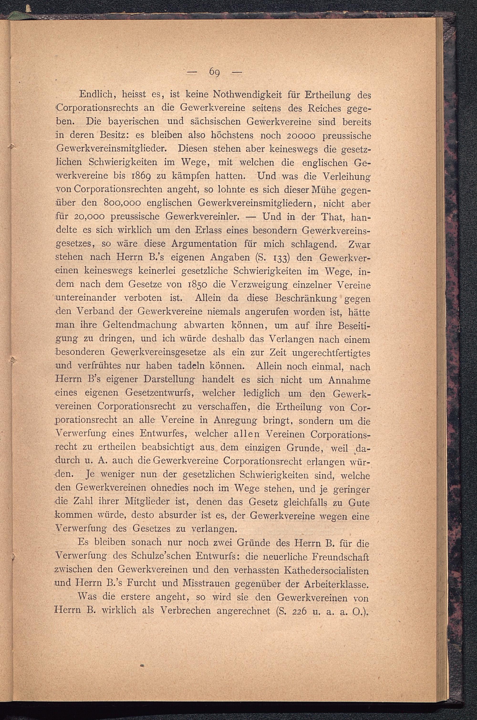 Endlich, heisst es, ist keine Nothwendigkeit für Ertheilung desCorporationsrechts an die Gewerkvereine seitens des Reiches gege-ben. Die bayerischen und sächsischen Gewerkvereine sind bereitsin deren Besitz: es bleiben also höchstens noch 20000 preussischeGewerkvereinsmitglieder. Diesen stehen aber keineswegs die gesetz-lichen Schwierigkeiten im Wege, mit welchen die englischen Ge-werkvereine bis 1869 zu kämpfen hatten. Und was die Verleihungvon Corporationsrechten angeht, so lohnte es sich dieser Mühe gegen-über den 800,000 englischen Gewerkvereinsmitgliedern, nicht aberfür 20,000 preussische Gewerkvereinler. — Und in der That, han-delte es sich wirklich um den Erlass eines besondern Gewerkvereins-gesetzes, so wäre diese Argumentation für mich schlagend. Zwarstehen nach Herrn B.’s eigenen Angaben (S. 133) den Gewerkver-einen keineswegs keinerlei gesetzliche Schwierigkeiten im Wege, in-dem nach dem Gesetze von 1850 die Verzweigung einzelner Vereineuntereinander verboten ist. Allein da diese Beschränkung gegenden Verband der Gewerkvereine niemals angerufen worden ist, hätteman ihre Geltendmachung abwarten können, um auf ihre Beseiti-gung zu dringen, und ich würde deshalb das Verlangen nach einembesonderen Gewerkvereinsgesetze als ein zur Zeit ungerechtfertigtesund verfrühtes nur haben tadeln können. Allein noch einmal, nachHerrn B’s eigener Darstellung handelt es sich nicht um Annahme•eines eigenen Gesetzentwurfs, welcher lediglich um den Gewerk-vereinen Corporationsrecht zu verschaffen, die Ertheilung von Cor-porationsrecht an alle Vereine in Anregung bringt, sondern um dieVerwerfung eines Entwurfes, welcher allen Vereinen Corporations-recht zu ertheilen beabsichtigt aus dem einzigen Grunde, weil da-durch u. A. auch die Gewerkvereine Corporationsrecht erlangen wür-den. Je weniger nun der gesetzlichen Schwierigkeiten sind, welcheden Gewerkvereinen ohnedies noch im Wege stehen, und je geringerdie Zahl ihrer Mitglieder ist, denen das Gesetz gleichfalls zu Gutekommen würde, desto absurder ist es, der Gewerkvereine wegen eineVerwerfung des Gesetzes zu verlangen.