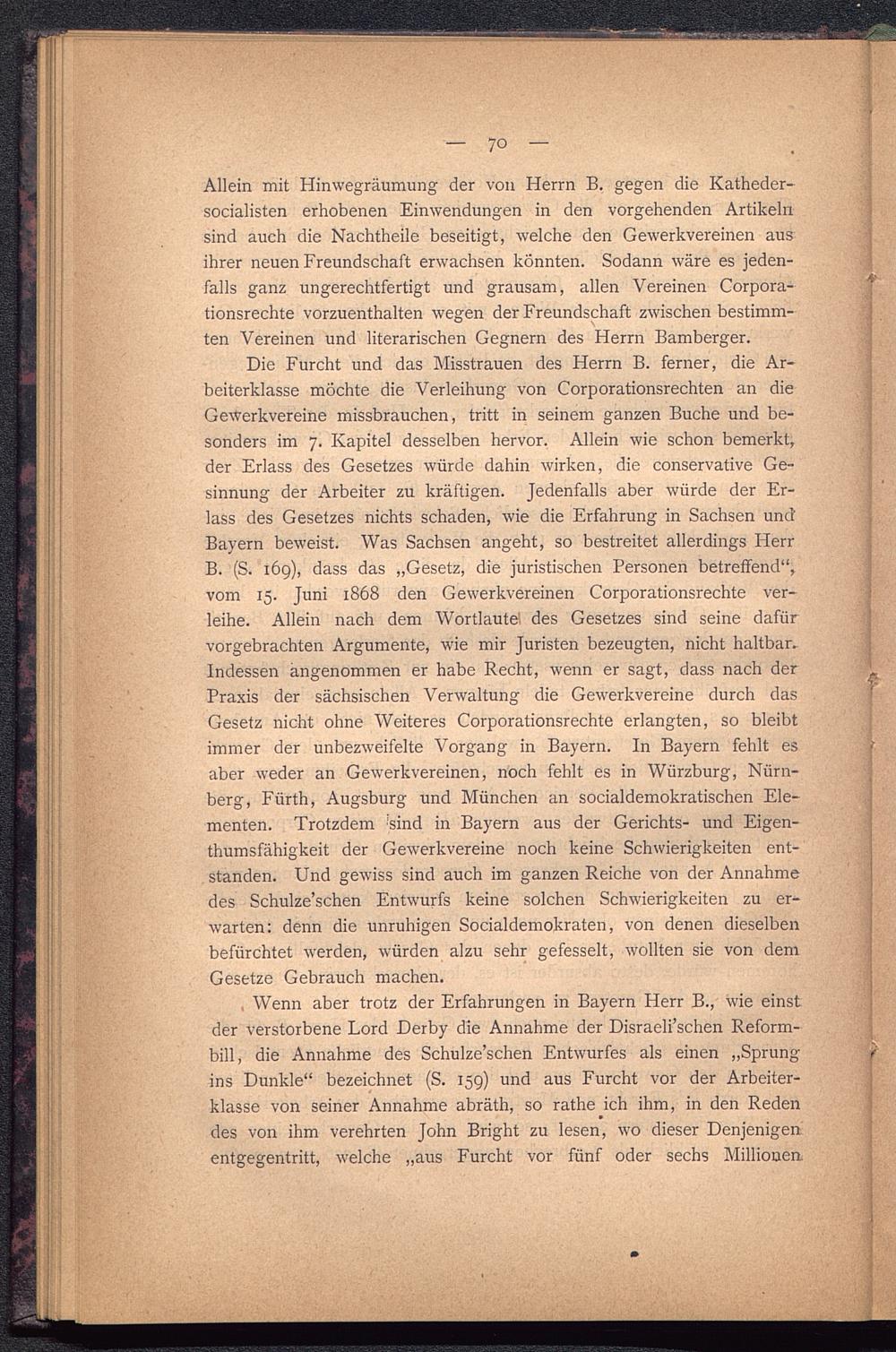 Die Furcht und das Misstrauen des Herrn B. ferner, die Ar-beiterklasse möchte die Verleihung von Corporationsrechten an dieGewerkvereine missbrauchen, tritt in seinem ganzen Buche und be-sonders im 7. Kapitel desselben hervor. Allein wie schon bemerkt,der Erlass des Gesetzes würde dahin wirken, die conservative Ge-sinnung der Arbeiter zu kräftigen. Jedenfalls aber würde der Er-lass des Gesetzes nichts schaden, wie die Erfahrung in Sachsen undBayern beweist. Was Sachsen angeht, so bestreitet allerdings HerrB. (S. 169), dass das „Gesetz, die juristischen Personen betreffend“,vom 15. Juni 1868 den Gewerkvereinen Corporationsrechte ver-leihe. Allein nach dem Wortlaute' des Gesetzes sind seine dafürvorgebrachten Argumente, wie mir Juristen bezeugten, nicht haltbar.Indessen angenommen er habe Recht, wenn er sagt, dass nach derPraxis der sächsischen Verwaltung die Gewerkvereine durch dasGesetz nicht ohne Weiteres Corporationsrechte erlangten, so bleibtimmer der unbezweifelte Vorgang in Bayern. In Bayern fehlt esaber weder an Gewerkvereinen, noch fehlt es in Würzburg, Nürn-berg, Fürth, Augsburg und München an socialdemokratischen Ele-menten. Trotzdem 'sind in Bayern aus der Gerichts- und Eigen-thumsfähigkeit der Gewerkvereine noch keine Schwierigkeiten ent-standen. Und gewiss sind auch im ganzen Reiche von der Annahmedes Schulze’schen Entwurfs keine solchen Schwierigkeiten zu er-warten: denn die unruhigen Socialdemokraten, von denen dieselbenbefürchtet werden, würden alzu sehr gefesselt, wollten sie von demGesetze Gebrauch machen.