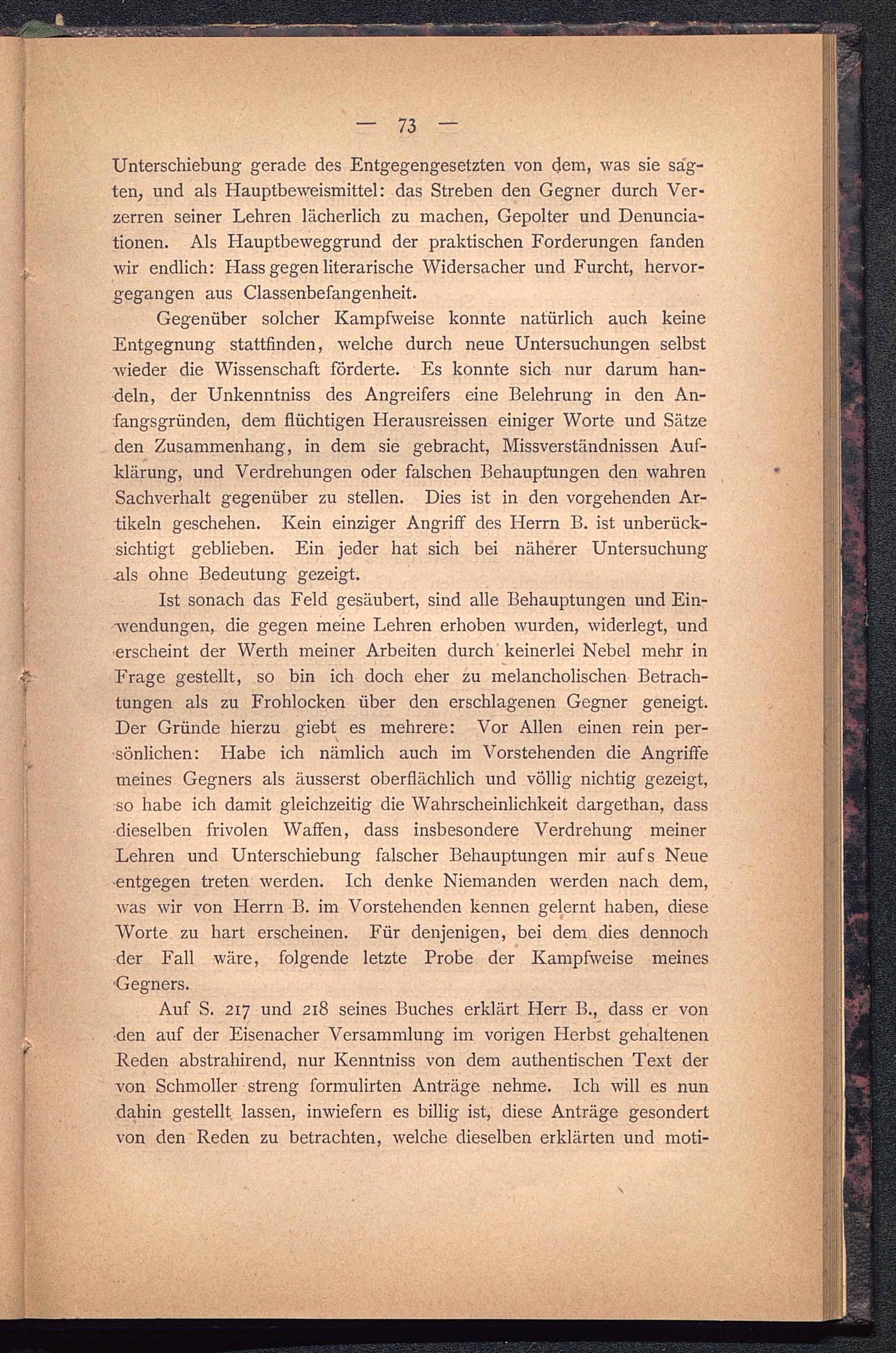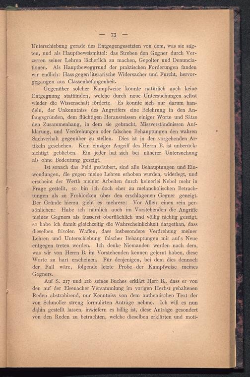 Auf S. 217 und 218 seines Buches erklärt Herr B., dass er von■den auf der Eisenacher Versammlung im vorigen Herbst gehaltenenReden abstrahirend, nur Kenntniss von dem authentischen Text dervon Schmoller streng formulirten Anträge nehme. Ich will es nundahin gestellt lassen, inwiefern es billig ist, diese Anträge gesondertvon den Reden zu betrachten, welche dieselben erklärten und moti-