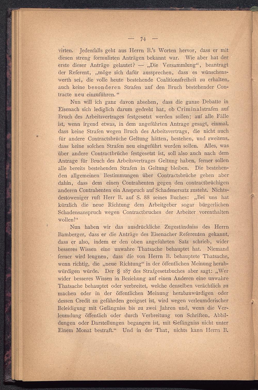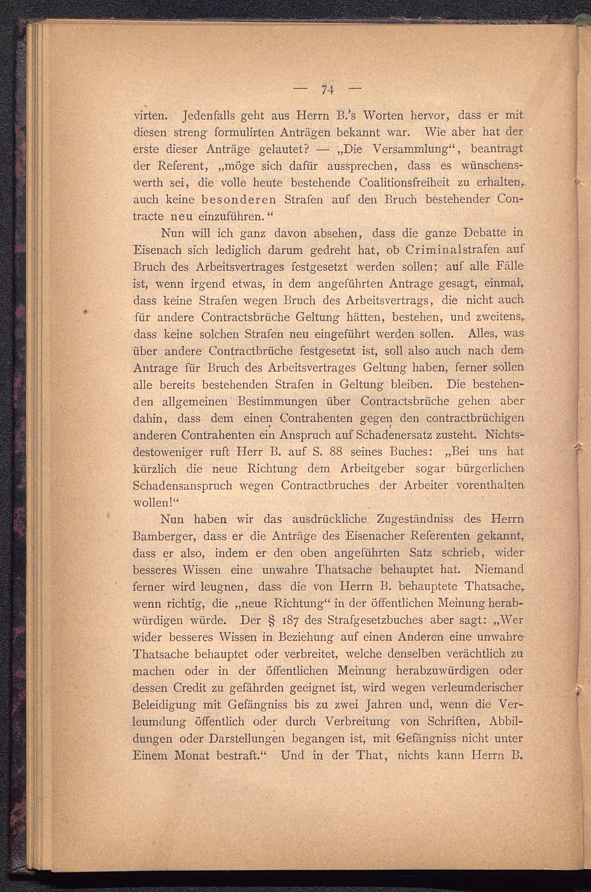 Nun haben wir das ausdrückliche Zugeständniss des HerrnBamberger, dass er die Anträge des Eisenacher Referenten gekannt,dass er also, indem er den oben angeführten Satz schrieb, widerbesseres Wissen eine unwahre Thatsache behauptet hat. Niemandferner wird leugnen, dass die von Herrn B. behauptete Thatsache ,wenn richtig, die „neue Richtung“ in der öffentlichen Meinung herab-würdigen würde. Der § 187 des Strafgesetzbuches aber sagt: „Werwider besseres Wissen in Beziehung auf einen Anderen eine unwahreThatsache behauptet oder verbreitet, welche denselben verächtlich zumachen oder in der öffentlichen Meinung herabzuwürdigen oderdessen Credit zu gefährden geeignet ist, wird wegen verleumderischer :