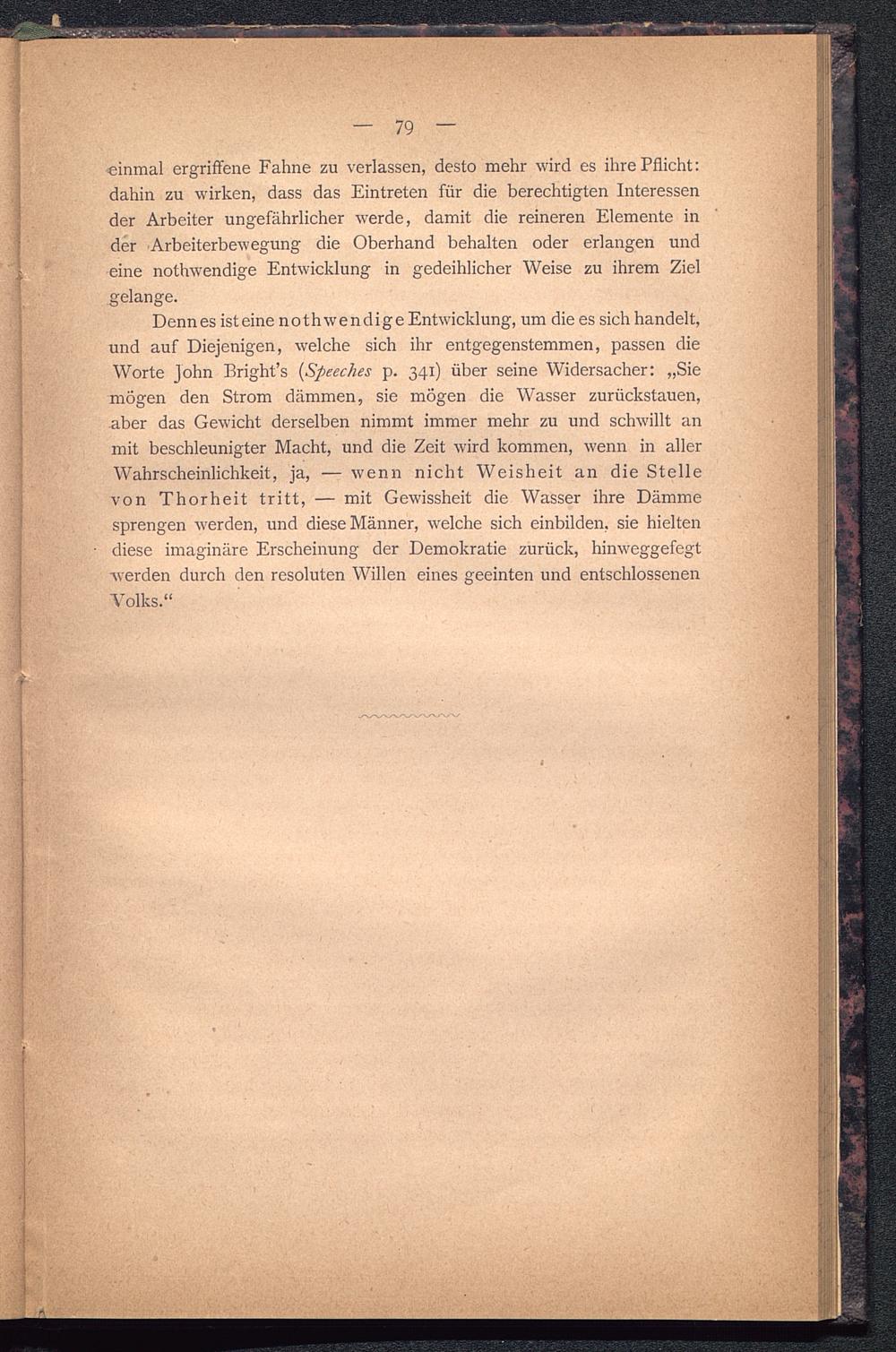 Denn es ist eine nothwendige Entwicklung, um die es sich handelt,und auf Diejenigen, welche sich ihr entgegenstemmen, passen dieWorte John Bright’s (Speeches p. 341) über seine Widersacher: „Siemögen den Strom dämmen, sie mögen die Wasser zurückstauen,aber das Gewicht derselben nimmt immer mehr zu und schwillt anmit beschleunigter Macht, und die Zeit wird kommen, wenn in allerWahrscheinlichkeit, ja, — wenn nicht Weisheit an die Stellevon Thorheit tritt, — mit Gewissheit die Wasser ihre Dämmesprengen werden, und diese Männer, welche sich einbilden, sie hieltendiese imaginäre Erscheinung der Demokratie zurück, hinweggefegtwerden durch den resoluten Willen eines geeinten und entschlossenenVolks.“