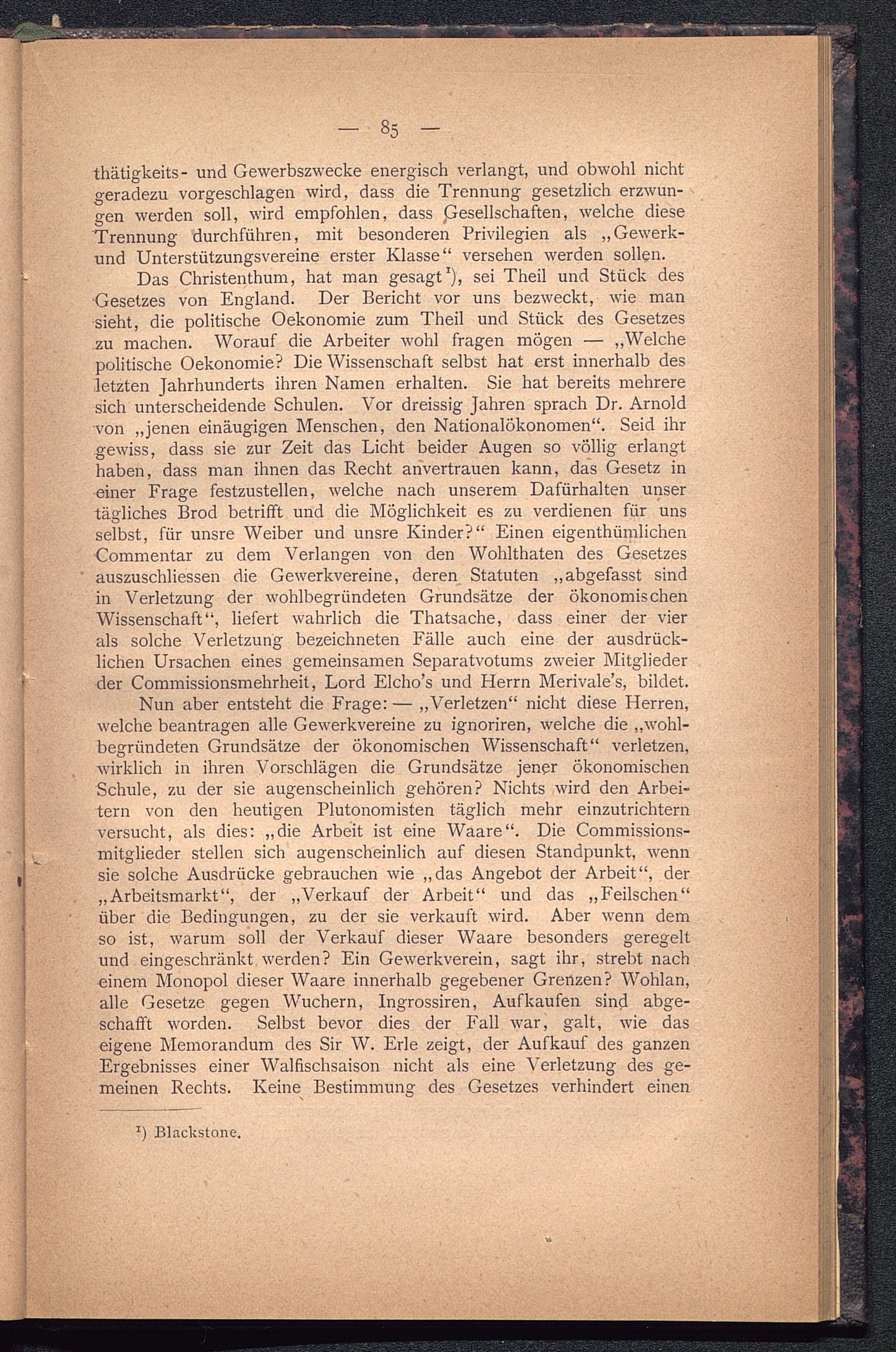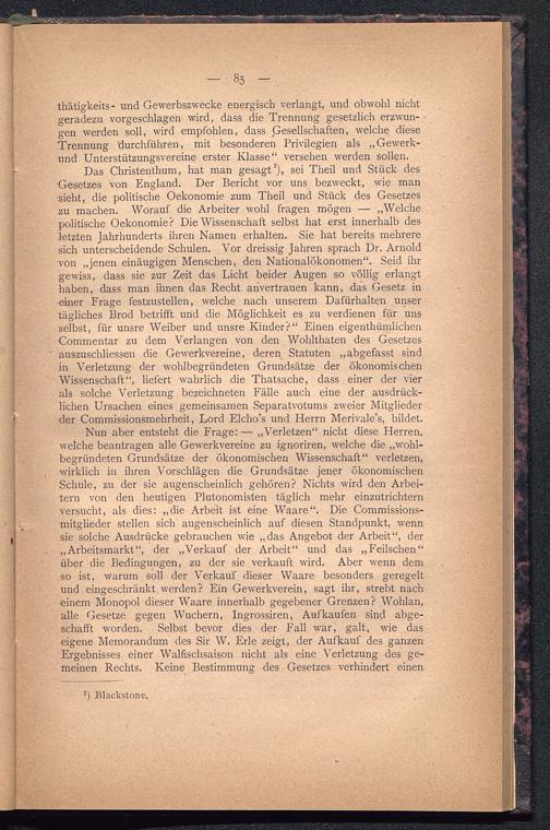 Das Christenthum, hat man gesagt 1 ), sei Theil und Stück des■Gesetzes von England . Der Bericht vor uns bezweckt, wie mansieht, die politische Oekonomie zum Theil und Stück des Gesetzeszu machen. Worauf die Arbeiter wohl fragen mögen — „Welchepolitische Oekonomie? Die Wissenschaft selbst hat erst innerhalb desletzten Jahrhunderts ihren Namen erhalten. Sie hat bereits mehreresich unterscheidende Schulen. Vor dreissig Jahren sprach Dr. Arnoldvon „jenen einäugigen Menschen, den Nationalökonomen“. Seid ihrgewiss, dass sie zur Zeit das Licht beider Augen so völlig erlangthaben, dass man ihnen das Recht anvertrauen kann, das Gesetz ineiner Frage festzustellen, welche nach unserem Dafürhalten unsertägliches Brod betrifft und die Möglichkeit es zu verdienen für unsselbst, für unsre Weiber und unsre Kinder?“ Einen eigenthümlichenCommentar zu dem Verlangen von den Wohlthaten des Gesetzesauszuschliessen die Gewerkvereine, deren Statuten „abgefasst sindin Verletzung der wohlbegründeten Grundsätze der ökonomischenWissenschaft“, liefert wahrlich die Thatsache, dass einer der vierals solche Verletzung bezeichneten Fälle auch eine der ausdrück-lichen Ursachen eines gemeinsamen Separatvotums zweier Mitgliederder Commissionsmehrheit, Lord Elcho’s und Herrn Merivale’s, bildet.