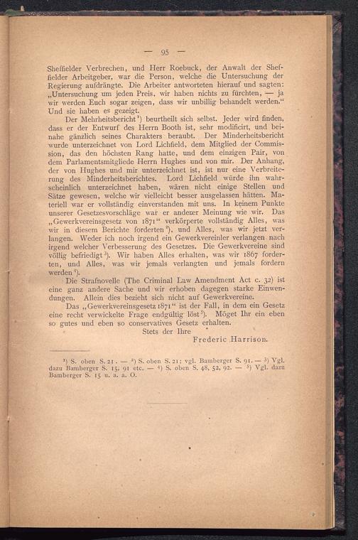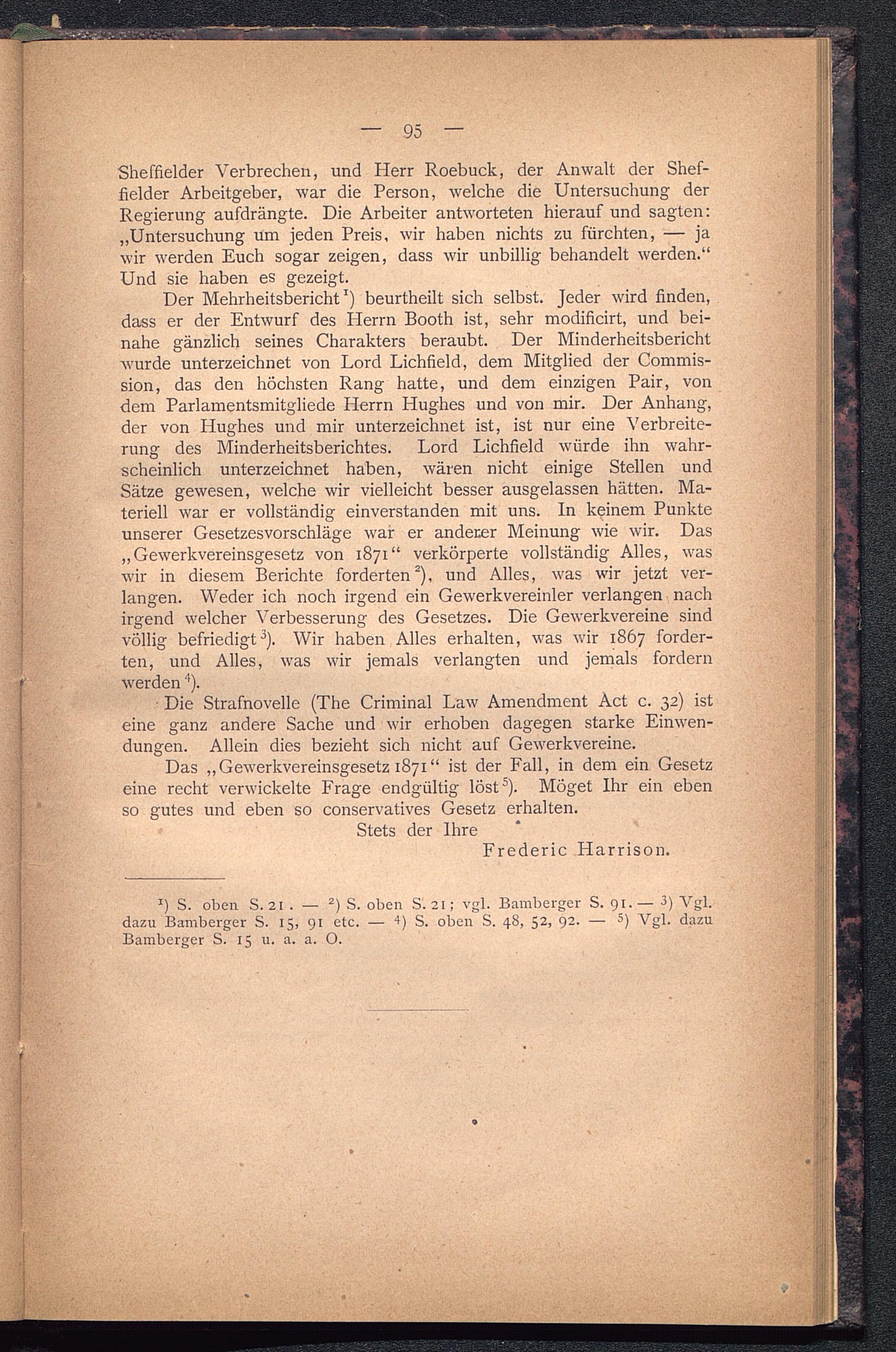 Der Mehrheitsbericht 1 ) beurtheilt sich selbst. Jeder wird finden,dass er der Entwurf des Herrn Booth ist, sehr modificirt, und bei-nahe gänzlich seines Charakters beraubt. Der Minderheitsberichtwurde unterzeichnet von Lord Lichfield, dem Mitglied der Commis-sion, das den höchsten Rang hatte, und dem einzigen Pair, vondem Parlamentsmitgliede Herrn Hughes und von mir. Der Anhang,der von Hughes und mir unterzeichnet ist, ist nur eine Verbreite-rung des Minderheitsberichtes. Lord Lichfield würde ihn wahr-scheinlich unterzeichnet haben, wären nicht einige Stellen undSätze gewesen, welche wir vielleicht besser ausgelassen hätten. Ma-teriell war er vollständig einverstanden mit uns. In keinem Punkteunserer Gesetzesvorschläge war er anderer Meinung wie wir. Das„Gewerkvereinsgesetz von 1871“ verkörperte vollständig Alles, waswir in diesem Berichte forderten 2 ), und Alles, was wir jetzt ver-langen. Weder ich noch irgend ein Gewerkvereinler verlangen nachirgend welcher Verbesserung des Gesetzes. Die Gewerkvereine sindvöllig befriedigt 3 ). Wir haben Alles erhalten, was wir 1867 forder-ten, und Alles, was wir jemals verlangten und jemals fordernwerden 4 ).