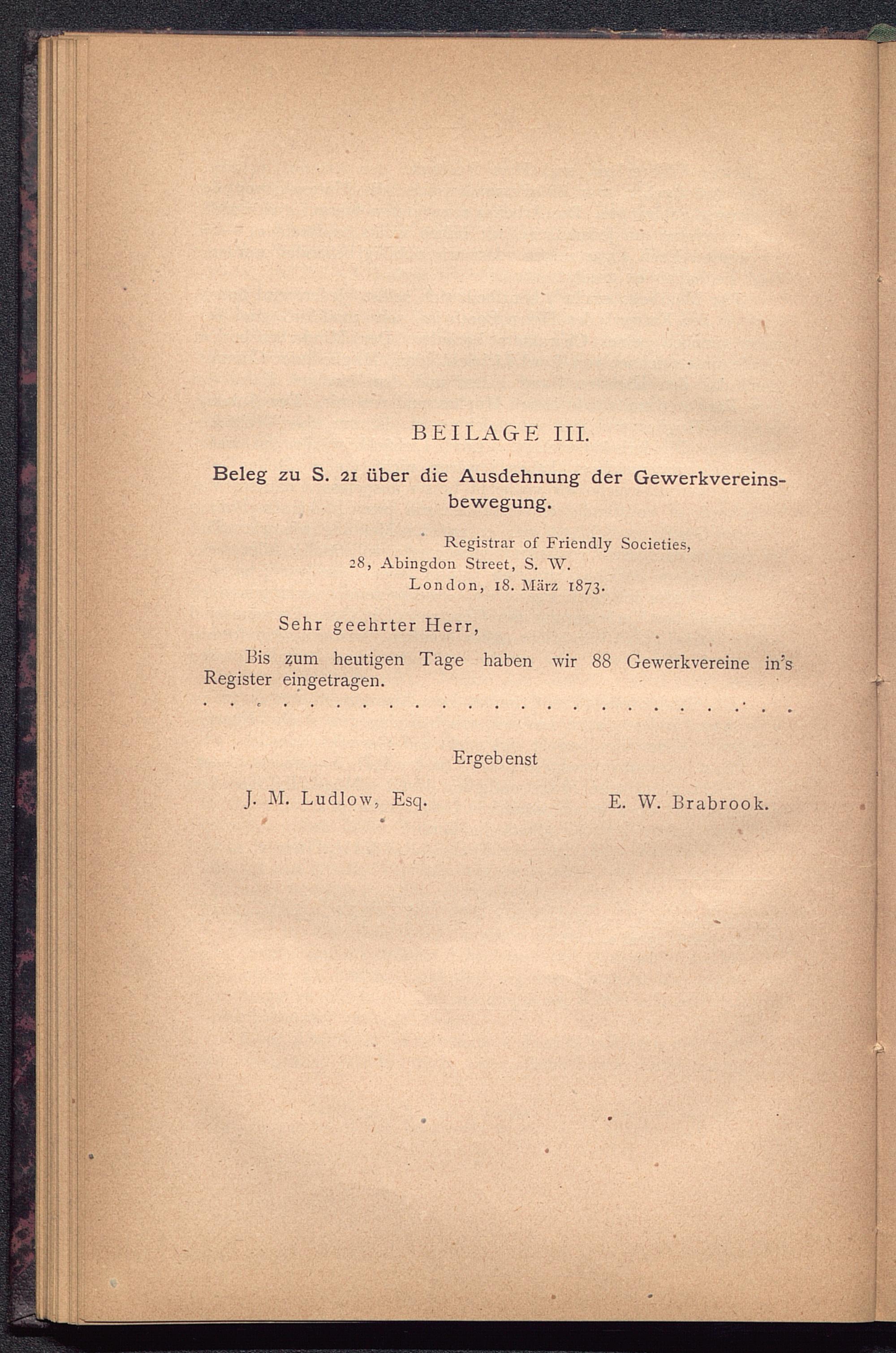 BEILAGE III.Beleg zu S. 21 über die Ausdehnung der Gewerkvereins-bewegung.Registrar of Friendly Societies,28, Abingdon Street, S. W.London , 18. März 1873.Sehr geehrter Herr,Bis zum heutigen Tage haben wir 88 Gewerkvereine in''sRegister eingetragen.ErgebenstJ. M. Ludlow, Esq.E. W. Brabrook.