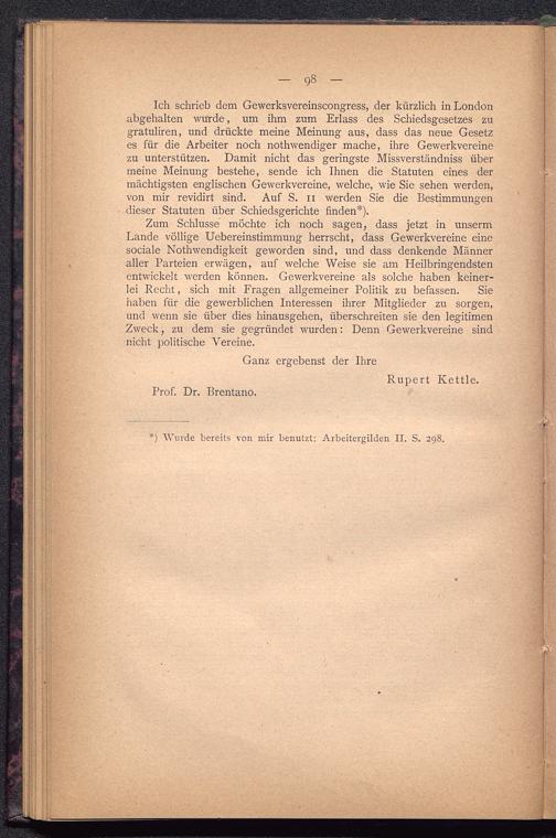 Ich schrieb dem Gewerksvereinscongress, der kürzlich in London abgehalten wurde, um ihm zum Erlass des Schiedsgesetzes zugratuliren, und drückte meine Meinung aus, dass das neue Gesetzes für die Arbeiter noch nothwendiger mache, ihre Gewerkvereinezu unterstützen. Damit nicht das geringste Missverständniss übermeine Meinung bestehe, sende ich Ihnen die Statuten eines dermächtigsten englischen Gewerkvereine, welche, wie Sie sehen werden,von mir revidirt sind. Auf S. n werden Sie die Bestimmungendieser Statuten über Schiedsgerichte finden*).