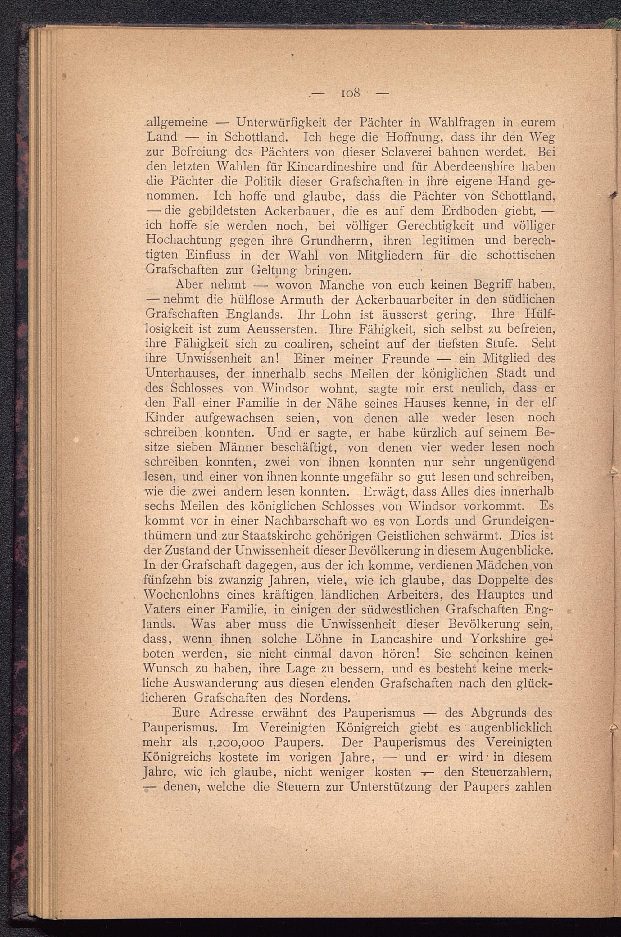 — nehmt die hülflose Armuth der Ackerbauarbeiter in den südlichenGrafschaften Englands . Ihr Lohn ist äusserst gering. Ihre Hülf-losigkeit ist zum Aeussersten. Ihre Fähigkeit, sich selbst zu befreien,ihre Fähigkeit sich zu coaliren, scheint auf der tiefsten Stufe. Sehtihre Unwissenheit an! Einer meiner Freunde — ein Mitglied desUnterhauses, der innerhalb sechs Meilen der königlichen Stadt unddes Schlosses von Windsor wohnt, sagte mir erst neulich, dass erden Fall einer Familie in der Nähe seines Hauses kenne, in der elfKinder aufgewachsen seien, von denen alle weder lesen nochschreiben konnten. Und er sagte, er habe kürzlich auf seinem Be-sitze sieben Männer beschäftigt, von denen vier weder lesen nochschreiben konnten, zwei von ihnen konnten nur sehr ungenügendlesen, und einer von ihnen konnte ungefähr so gut lesen und schreiben,wie die zwei andern lesen konnten. Erwägt, dass Alles dies innerhalbsechs Meilen des königlichen Schlosses von Windsor vorkommt. Eskommt vor in einer Nachbarschaft wo es von Lords und Grundeigen-thümern und zur Staatskirche gehörigen Geistlichen schwärmt. Dies istder Zustand der Unwissenheit dieser Bevölkerung in diesem Augenblicke.In der Grafschaft dagegen, aus der ich komme, verdienen Mädchen.vonfünfzehn bis zwanzig Jahren, viele, wie ich glaube, das Doppelte desWochenlohns eines kräftigen, ländlichen Arbeiters, des Hauptes undVaters einer Familie, in einigen der südwestlichen Grafschaften Eng-lands . Was aber muss die Unwissenheit dieser Bevölkerung sein,dass, wenn ihnen solche Löhne in Lancashire und Yorkshire ge-boten werden, sie nicht einmal davon hören! Sie scheinen keinenWunsch zu haben, ihre Lage zu bessern, und es besteht keine merk-liche Auswanderung aus diesen elenden Grafschaften nach den glück-licheren Grafschaften des Nordens.
