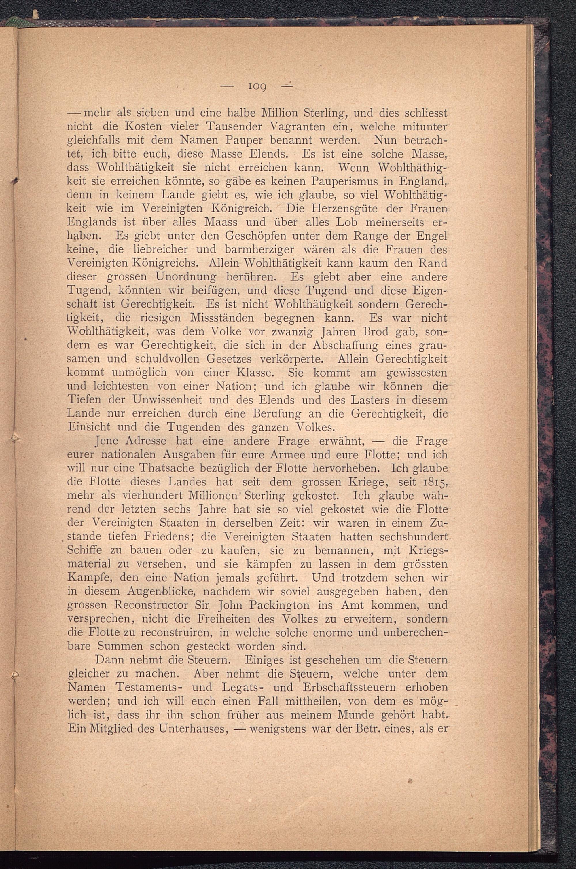 —• mehr als sieben und eine halbe Million Sterling, und dies schliesstnicht die Kosten vieler Tausender Vagranten ein, welche mituntergleichfalls mit dem Namen Pauper benannt werden. Nun betrach-tet, ich bitte euch, diese Masse Elends. Es ist eine solche Masse,dass Wohlthätigkeit sie nicht erreichen kann. Wenn Wohlthäthig-keit sie erreichen könnte, so gäbe es keinen Pauperismus in England ,denn in keinem Lande giebt es, wie ich glaube, so viel Wohlthätig-keit wie im Vereinigten Königreich . Die Plerzensgiite der FrauenEnglands ist über alles Maass und über alles Lob meinerseits er-haben. Es giebt unter den Geschöpfen unter dem Range der Engelkeine, die liebreicher und barmherziger wären als die Frauen desVereinigten Königreichs . Allein Wohlthätigkeit kann kaum den Randdieser grossen Unordnung berühren. Es giebt aber eine andereTugend, könnten wir beifügen, und diese Tugend und diese Eigen-schaft ist Gerechtigkeit. Es ist nicht Wohlthätigkeit sondern Gerech-tigkeit, die riesigen Missständen begegnen kann. Es war nichtWohlthätigkeit, was dem Volke vor zwanzig Jahren Brod gab, son-dern es war Gerechtigkeit, die sich in der Abschaffung eines grau-samen und schuldvollen Gesetzes verkörperte. Allein Gerechtigkeitkommt unmöglich von einer Klasse. Sie kommt am gewissestenund leichtesten von einer Nation; und ich glaube wir können dieTiefen der Unwissenheit und des Elends und des Lasters in diesemLande nur erreichen durch eine Berufung an die Gerechtigkeit, dieEinsicht und die Tugenden des ganzen Volkes.