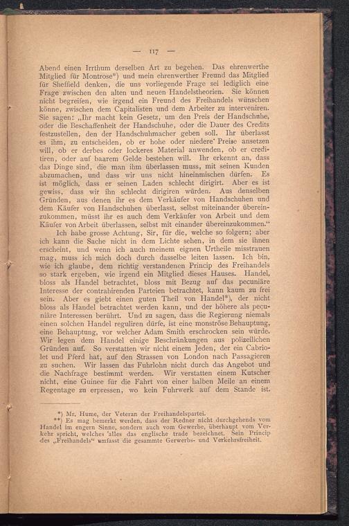 **) Es mag bemerkt werden, dass der Redner nicht durchgeliends vomHandel im engern Sinne, sondern auch vom Gewerbe, überhaupt vom Ver-kehr spricht, welches 'alles das englische trade bezeichnet. Sein Principdes „Freihandels“ umfasst die gesammte Gerwerbs- und Verkehrsfreiheit.