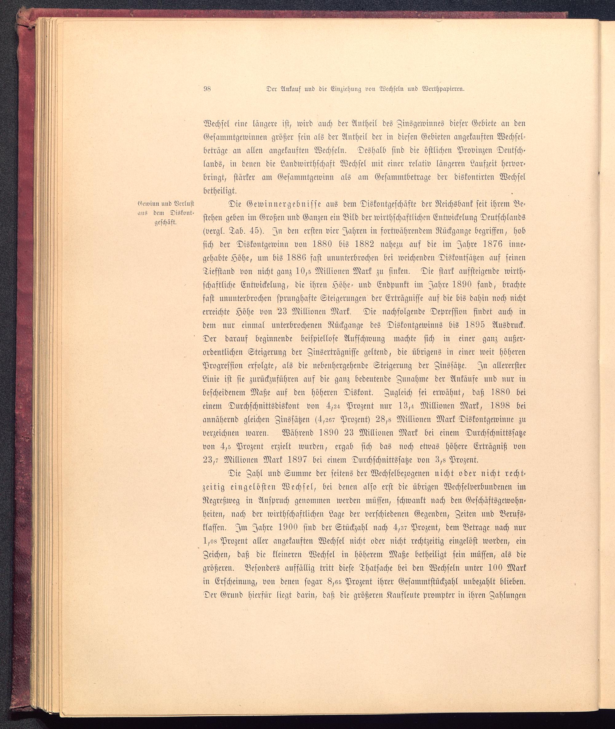 (vergl. Tab. 45). In den ersten vier Iahren in fortwährendem Rückgange begriffen, hobsich der Diskontgewinn von 1880 bis 1882 nahezu auf die im Jahre 1876 inne-gehabte Höhe, um bis 1886 fast ununterbrochen bei weichenden Diskontosätzen auf seinenTiefstand von nicht ganz 10,5 Millionen Mark zu sinken. Die stark aufsteigende wirth-schaftliche Entwickelung, die ihren Höhe- und Endpunkt im Jahre 1890 fand, brachtefast unuuterbrochen sprunghafte Steigerungen der Erträgnisse auf die bis dahin noch nichterreichte Höhe von 23 Millionen Mark. Die nachfolgende Depression findet auch indem nur einmal unterbrochenen Rückgange des Diskontgewinns bis 1895 Ausdruck.Der darauf beginnende beispiellose Aufschwung machte sich in einer ganz außer-ordentlichen Steigerung der Zinserträgnisse geltend, die übrigens in einer weit höherenProgression erfolgte, als die nebenhergehende Steigerung der Zinssätze. In allerersterLinie ist sie zurückzuführen auf die ganz bedeutende Zunahme der Ankäufe und uur inbescheidenem Maße auf den höheren Diskont. Zugleich sei erwähnt, daß 1880 beieinem Durchschnittsdiskont von 4,24 Prozent nur 13,4 Millionen Mark, 1898 beiannähernd gleichen Zinssätzen (4,26? Prozent) 28,8 Millionen Mark Diskontgewinne zuverzeichnen waren. Während 1890 23 Millionen Mark bei einem Durchschuittssatzevon 4,s Prozent erzielt wurden, ergab sich das noch etwas höhere Erträgniß von23,7 Millionen Mark 1897 bei einem Dnrchschnittssatze von 3,« Prozent.