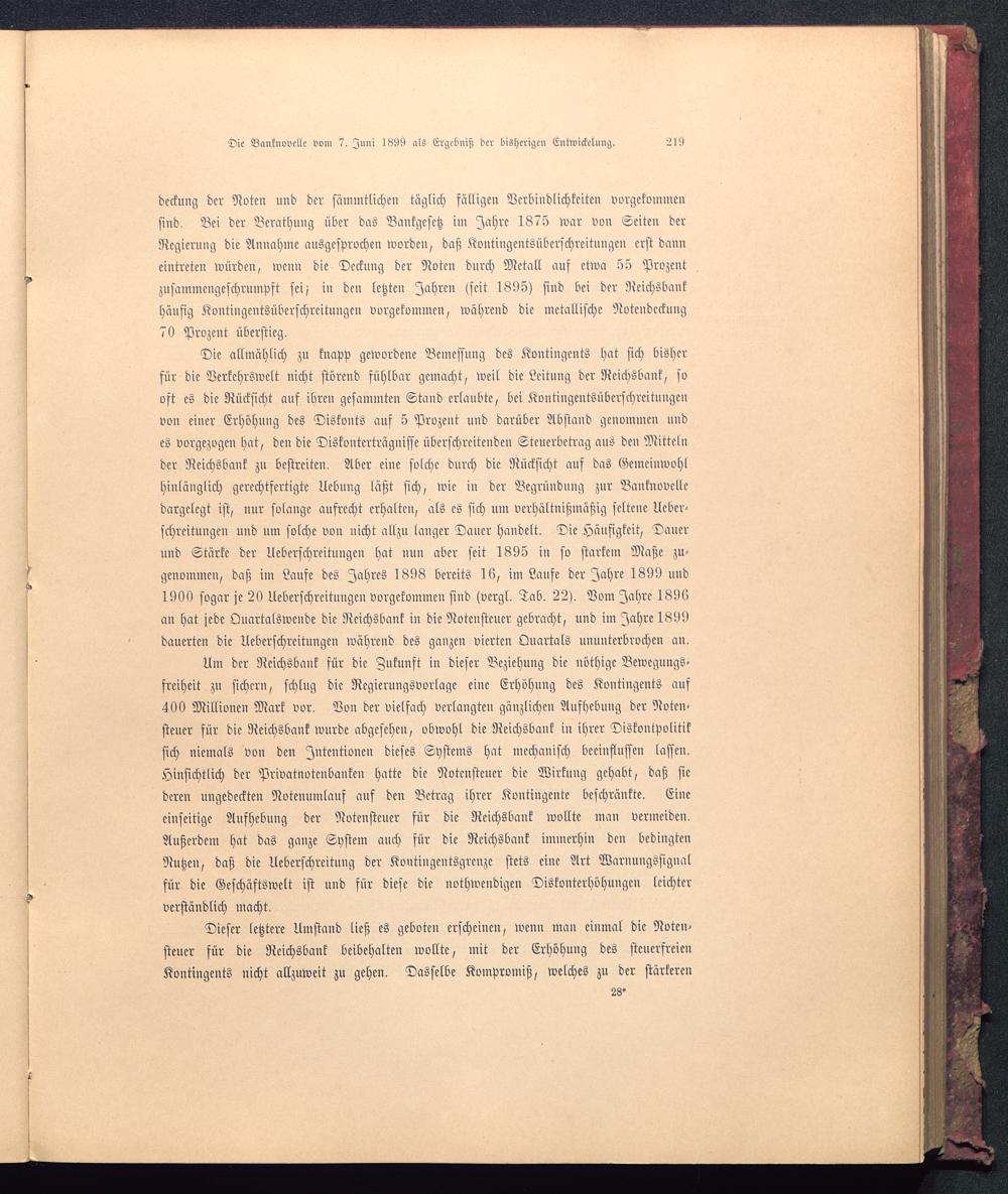 deckung der Noten und der sämmtlichen täglich fälligen Verbindlichkeiten vorgekommensind. Bei der Berathung über das Bankgesetz im Jahre 1875 war von Seiten derRegierung die Annahme ausgesprochen worden, daß Kontingcntsüberschreitungen erst danneintreten würden, wenn die Deckung der Noten durch Metall auf etwa 55 Prozentzusammengeschrumpft seij in den letzten Iahren (seit 1895) sind bei der Neichsbankhäufig Kontingentsüberschreitungen vorgekommen, während die metallische Noteudcckung70 Prozent überstieg.