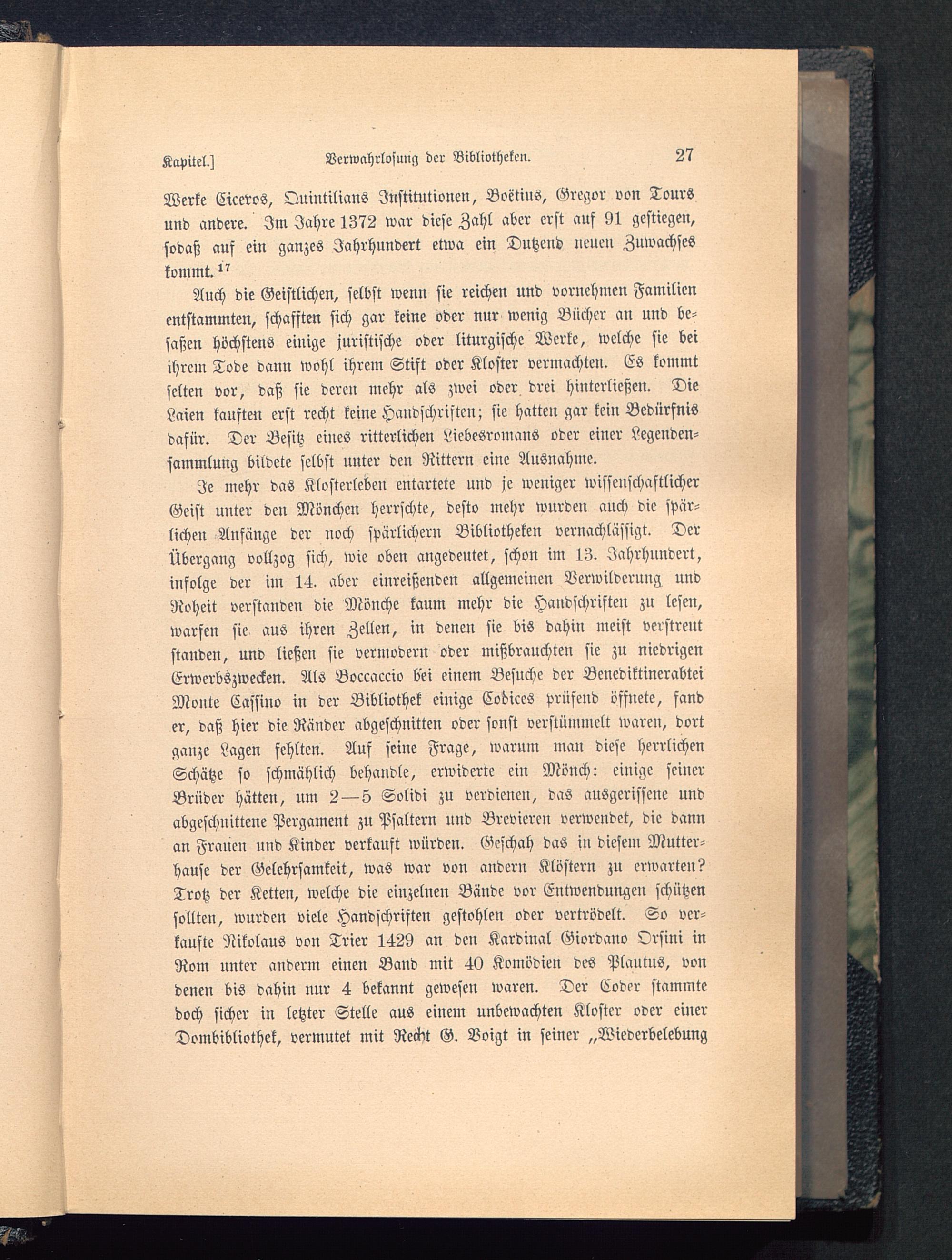 Je mehr das Klosterleben entartete und je weniger wissenschaftlicherGeist unter den Mönchen herrschte, desto mehr wurden auch die spär-lichen Anfänge der noch spärlichen: Bibliotheken vernachlässigt. DerÜbergang vollzog sieb, wie oben angedeutet, schon im 13. Jahrhundert,infolge der im 14. aber einreißenden allgemeinen Verwilderung undRoheit verstanden die Mönche kaum mehr die Handschriften zu lesen,warfen sie aus ihren Zellen, in denen sie bis dahin meist verstreutstanden, und ließen sie vermodern oder mißbrauchten sie zu niedrigenErwerbszwecken. Als Boccaccio bei einem Besuche der BenediktinerabteiMonte Cassino in der Bibliothek einige Codices prüfend öffnete, fander, daß hier die Ränder abgeschnitten oder sonst verstümmelt waren, dortganze Lagen fehlten. Auf seine Frage, warum man diese herrlichenSchätze so schmählich behandle, erwiderte ein Mönch: einige seinerBrüder hätten, um 2—5 Solidi zu verdienen, das ausgerisscne undabgeschnittene Pergament zu Psaltern und Brevieren verwendet, die dannan Frauen und Kinder verkauft würden. Geschah das in diesem Mutter-hause der Gelehrsamkeit, was war von andern Klöstern zu erwarten?Trotz der Ketten, welche die einzelnen Bände vor Entwendungen schützensollten, wurden viele Handschriften gestohlen oder vertrödelt. So ver-kaufte Nikolaus von Trier 1429 an den Kardinal Giordano Orsini inRom unter auderm einen Band mit 40 Komödien des Plautus, vondenen bis dahin nur 4 bekannt gewesen waren. Der Codex stammtedoch sicher in letzter Stelle aus einem unbewachten Kloster oder einerDombibliothek, vermutet mit Reckt G. Voigt in seiner „Wiederbelebung