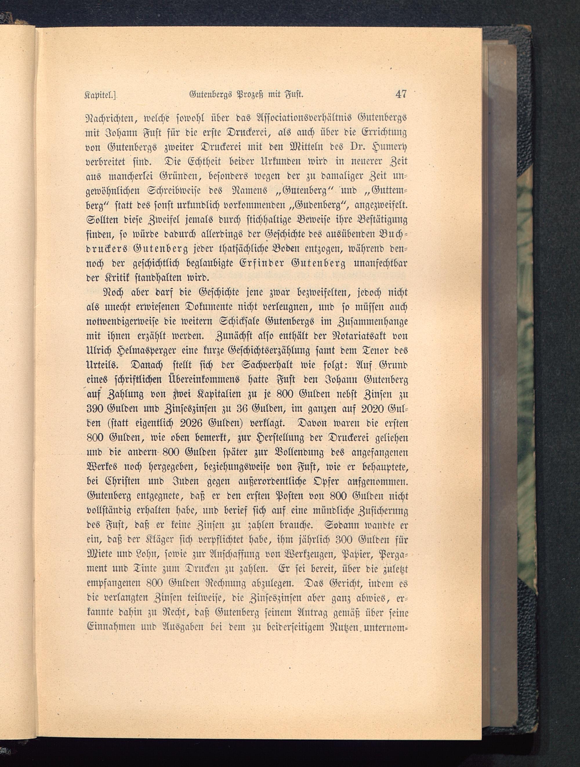 Nachrichten, welche sowohl über das Associationsverhältnis Gutenbergs mit Johann Fust für die erste Druckerei, als auch über die Errichtungvon Gutenbergs zweiter Druckerei mit den Mitteln des Dr. Humcryverbreitet sind. Die Echtheit beider Urkunden wird in neuerer Zeitaus mancherlei Gründen, besonders wegen der zu damaliger Zeit un-gewöhnlichen Schreibweise des Namens „Gutenberg " und „Guttem-berg" statt des sonst urkundlich vorkommenden „Gudenberg", angezweifelt.Sollten diese Zweifel jemals durch stichhaltige Beweise ihre Bestätigungfinden, so würde dadurch allerdings der Geschichte des ausübenden Buch-druckers Gutenberg jeder thatsächliche Boden entzogen, während den-noch der geschichtlich beglaubigte Erfinder Gutenberg unanfechtbarder Kritik standhalten wird.