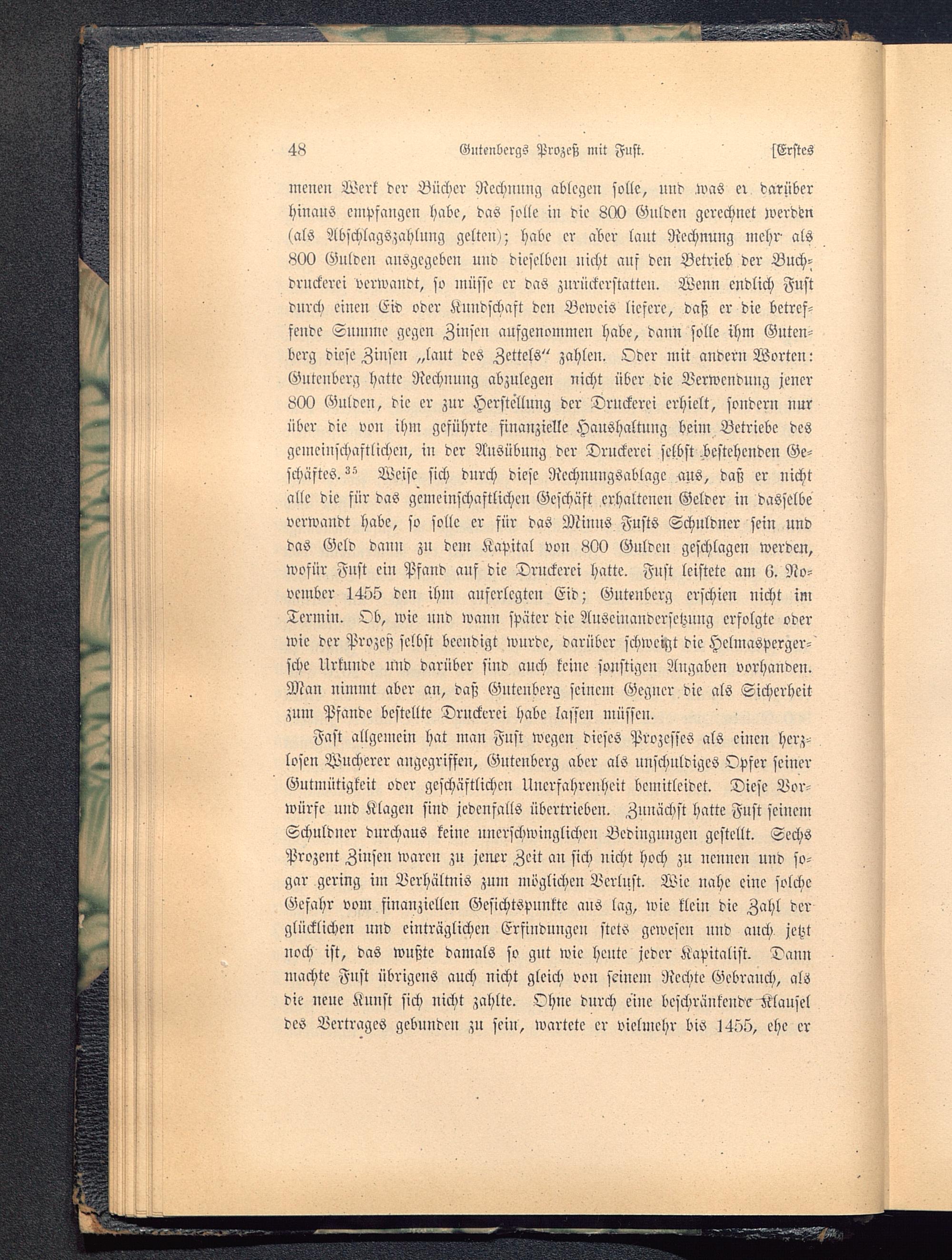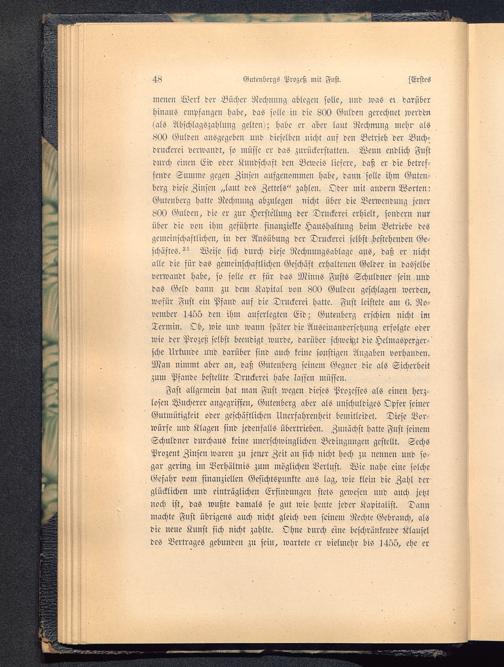 mcnen Werk der Bücher Rechnung ablegen solle, und U'as er darüberhinanS empfangen habe, das solle in die 800 Gulden gerechnet werdenlals Abschlagszahlung gelten); habe er aber laut Rechnung mehr- als800 Gulden ausgegeben und dieselben nicht auf den Betrieb der Buch-druckern verwandt, so müsse er das zurückerstatten. Wenn endlich Fustdurch ciueu Ew oder Kundschaft dcu Beweis liefere, daß er die betref-fende Summe gegen Zinsen aufgenommen habe, dann solle ihm Guten-berg diese Zinsen „laut des Zettels" zahlen. Oder mit andern Worten:Gntenberg hatte Rechnung abzulegen nicht über die Verwendung jener800 Gnlden, die er zur Herstellung der Druckerei erhielt, sondern nurüber die von ihm geführte finanzielle Haushaltung beim Betriebe desgemeinschaftlichen, in der Ausübung der Druckerei selbst.bestehenden Ge-schäftes. ^ Weise sich durch diese RcchnungSablagc aus, daß er nichtalle die für das gemeinschaftlichen Geschäft erhaltenen Gelder in dasselbeverwandt habe, so solle er für das Minus Fusts Schuldner sein unddas Geld dann zu dem Kapital von 800 Gulden geschlagen werden,wofür Fust ein Pfand auf die Drnckerci hatte. Fust leistete am li. No-vember 1455 den ihm auferlegten Eid; Gntenberg erschien nicht imTermin. Ob, wie und wauu später die Auseinandersetzung erfolgte oderwie der Prozeß selbst beendigt wurde, darüber schwerst die HclmaSperger-scke Urkunde und darüber sind anch keine sonstigen Angaben vorhanden.Man nimmt aber an, daß Guteuberg seiucm Gegner die als Sicherheitzum Pfande bestellte Druckerei habe lassen müssen.