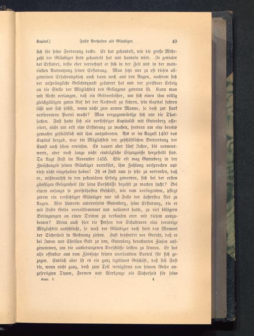 sich für seine Forderung deckte. Er hat gehandelt, wie die große Mehr-zahl der Gläubiger stets gehandelt hat und handeln wird. Je genialerder Erfinder, desto eher verrechnet er sich in der Zeit und in der mate-riellen Ausnutzung seiner Erfindung. Man setzt nur zu oft diesen all-gemeinen Erfahrungssatz auch dann noch aus den Augen, nachdem sichder ursprüngliche Gesichtspunkt geändert hat und der greifbare Erfolgan die Stelle der Möglichkeit des Gelingens getreten ist. Kann manmit Recht verlangen, daß ein Geldverleiher, um sich einen ihm völliggleichgültigen guten Ruf bei der Nachwelt zu sichern, sein Kapital fahrenläßt und sich selbst, wenn nicht zum armen Manne, so doch zur starkverlierenden Partei macht? Man vergegenwärtige sich nur die That-sachen. Fust hatte sich als vorsichtiger Kapitalist mit Gutenberg asso-ciiert, nicht um erst eine Erfindung zu machen, sondern um eine bereitsgemachte geschäftlich mit ihm auszubeuten. Als er im August 1450 dasKapital hergab, war die Möglichkeit der geschäftlichen Verwertung derKunst auch schon erwiesen. Es dauert aber fünf Jahre, bis nennens-werte, aber noch lange nicht einträgliche Erzeugnisse hergestellt sind.Da klagt Fust im November 1455. Wie oft mag Gutenberg in derZwischenzeit seinen Gläubiger vertröstet, ihm Zahlung versprochen uyddiese nicht eingehalten haben! Ist es Fust nun so sehr zu verdenken, daßer, mißtrauisch in den pekuniären Erfolg geworden, sich bei der erstengünstigen Gelegenheit für seine Vorschüsse bezahlt zu machen sucht? Beieinem anfangs so zweifelhaften Geschäft, wie dem vorliegenden, pflegtzudem ein vorsichtiger Gläubiger nur im Falle der äußersten Not zuklagen. Wer hinderte andererseits Gutenberg , seine Erfindung, die ermit Fnsts Gelde vervollkommnet und vollendet hatte, zu viel billigernBedingungen an einen Dritten zu verkaufen oder mit diesem auszu-beuten? Wenu auch hier die Person des Schuldners eine derartigeMöglichkeit ausschließt, so muß der Gläubiger doch stets das Momentder Sicherheit in Rechnung ziehen. Fust beschwört vor Gericht, daß erbei Juden und Christen Geld zu den, Gutenberg berechneten Zinsen auf-genommen, um die ausbedungenen Vorschüsse leisten zu können. Er hatalso offenbar aus dem Zinssatze keinen unerlaubten Vorteil für sich ge-zogen. Endlich aber ist es ein ganz legitimes Geschäft, daß sich Fustdie, wenn nicht ganz, doch zum Teil wenigstens von seinem Gelde an-gefertigten Typen, Formen und Werkzeuge als Sicherheit für seine