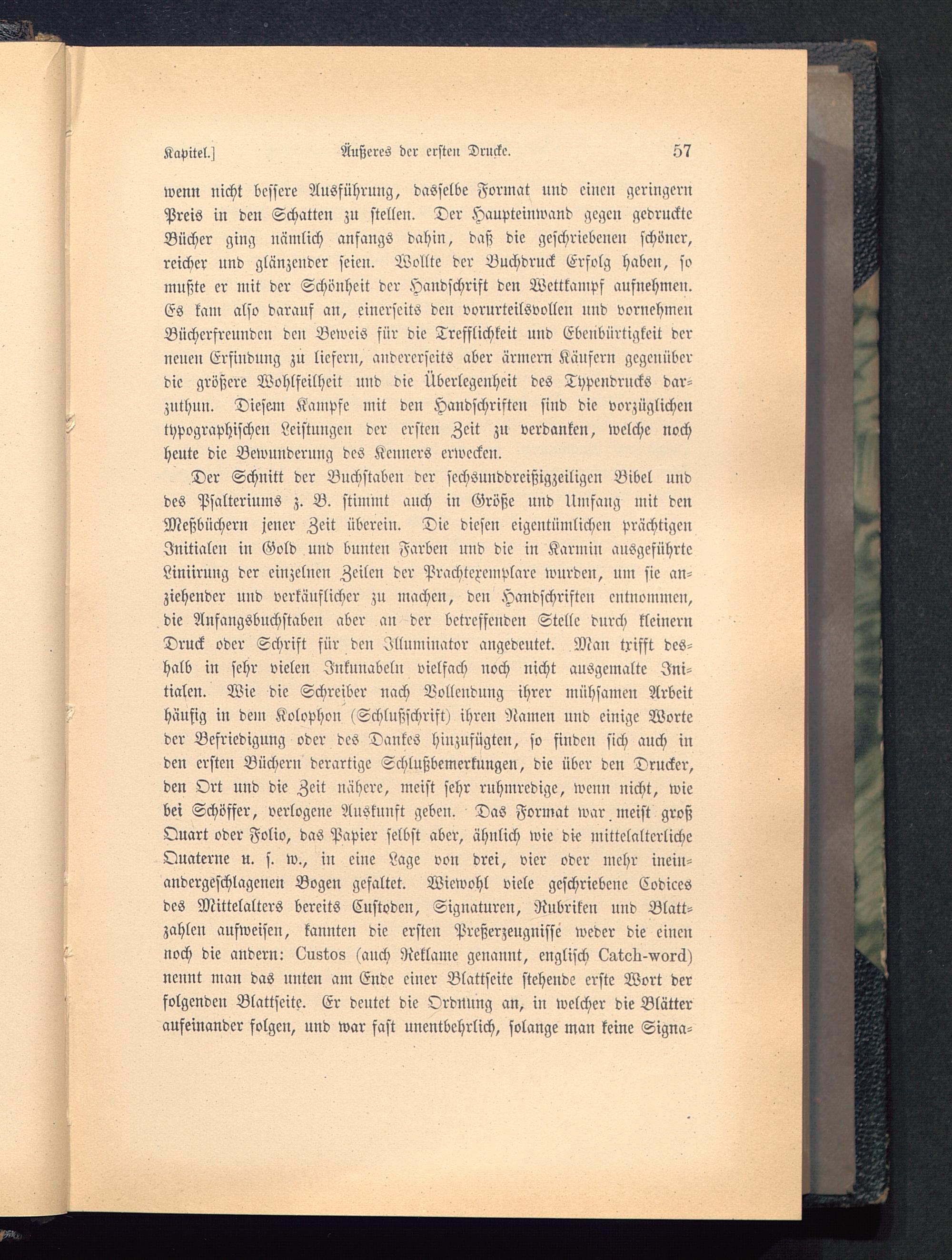 Der Schnitt der Buchstaben der scchsunddreißigzeiligcu Bibel unddes Psalteriums z. B. stimmt auch in Größe nnd Umfang mit denMeßbüchern jener Zeit übcrein. Die diesen eigentümlichen prächtigenInitialen in Gold und bunten Farben und die in Karmin ausgeführteLiniirung der einzelnen Zeilen der Prachtexemplare wurden, um sie an-ziehender und verkäuflicher zu machen, den Handschriften entnommen,die Anfangsbuchstaben aber an der betreffenden Stelle durch kleinernDruck oder Schrift für den Illuminator angedeutet. Man trifft des-halb in sehr vielen Inkunabeln vielfach noch nicht ausgemalte Ini-tialen. Wie die Schreiber nach Vollendung ihrer mühsamen Arbeithäusig in dem Kolophon (Schlußschrift) ihren Namen und einige Worteder Befriedigung oder des Dantes hinzufügten, so finden sich auch inden ersten Bücheru derartige Schlußbemerkungen, die über den Drucker,den Ort und die Zeit nähere, meist sehr ruhmredige, weun nicht, wiebei Schöffer, verlogene Auskunft geben. Das Format war. meist großQuart oder Folio, das Papier selbst aber, ähnlich wie die mittelalterlicheOuaterne u. s. w., iu eine Lage von drei, vier oder mehr inein-andergeschlagenen Bogen gefaltet. Wiewohl viele geschriebene Codicesdes Mittelalters bereits Custoden, Signaturen, Rubriken uud Blatt-zahleu aufweisen, kannten die ersten Prcßerzeugnisse weder die einennoch die andern: lüustos (auch Reklame genannt, englisch (^teli-vorä)nennt man das unten am Ende einer Blattscite stehende erste Wort derfolgenden Blattseite. Er deutet die Ordnung an, in welcher die Blätteraufeinander folgen, und war fast unentbehrlich, solange man keine Signa-