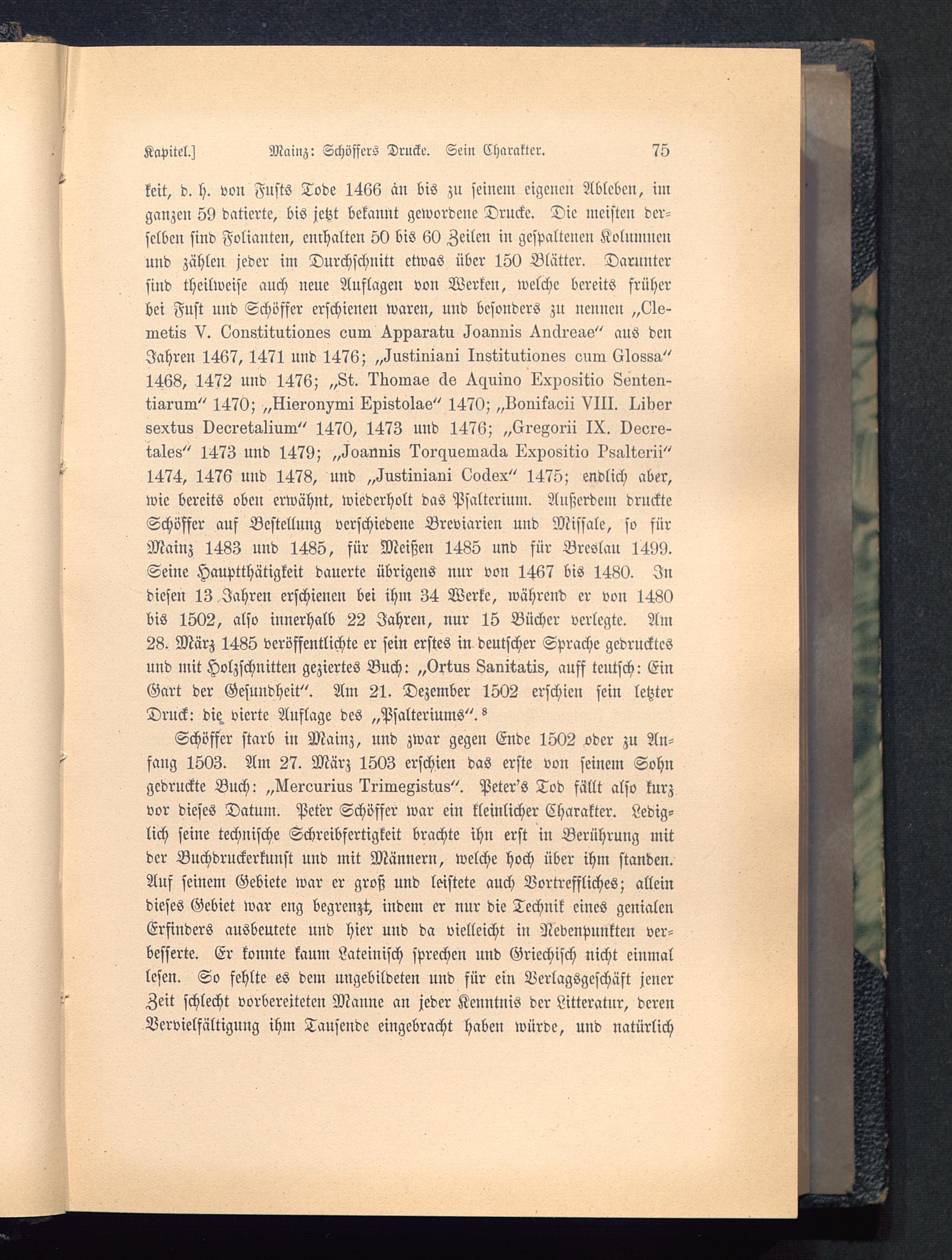 keit, d. h. von FustS Tode 1466 an bis zu seinein eigenen Ableben, imganzen 59 datierte, bis jetzt bekannt gewordene Drucke. Die meisten der-selben sind Folianten, enrhalten 50 bis 60 Zeilen in gespaltenen Kolumnenund zählen jeder im Durchschnitt etwas über 150 Blätter. Daruntersind theilweise auch neue Auflagen von Werken, welche bereits früherbei Fust und Schöffer erschienen waren, und besonders zn nennen „Lie-illstis V. Oonstitutionss ourn ^xxarg.tu ^vannis ^.näio^cz" ans denJahren 1467, 1471 und 1476; „^nstiinani Institutionss cmrn (Aossa,"1468, 1472 und 1476; „Lt. Itwmaiz cle ^.huino Lxpositio Lviitön-tiarnrn" 1470; „Lisron^mi Lxistolas" 1470; „Lonik-ieii VIII. I^ibörssxtus vsorötalium" 1470, 1473 und 1476; „(-regorii IX. veors-tales" 1473 und 1479; „^oarmis Imciusm^ä^ Lxpositio I^nltorii"1474, 1476 und 1478, und „^ustinialli Loäsx" 1475; endlich aber,wie bereits oben erwähnt, wiederholt das Psalterium. Außerdem druckteSchöffcr auf Bestellung verschiedene Breviarien und Missale, so fürMainz 1483 und 1485, für Meißen 1485 und für BreLlau 1499.Seine Hauptthätigkeit dauerte übrigens nur von 1467 bis 1480. Indiesen 13 Jahren erschienen bei ihm 34 Werke, während er von 1480bis 1502, also innerhalb 22 Jahren, nur 15 Bücher verlegte. Am28. März 1485 veröffentlichte er sein erstes in deutscher Sprache gedrucktesund mit Holzschnitten geziertes Buch: „Orws Sanitatis, aufs teutsch: EinGart der Gesundheit". Am 21. Dezember 1502 erschien sein letzterDruck: die. vierte Auflage des „Psalteriums ". °