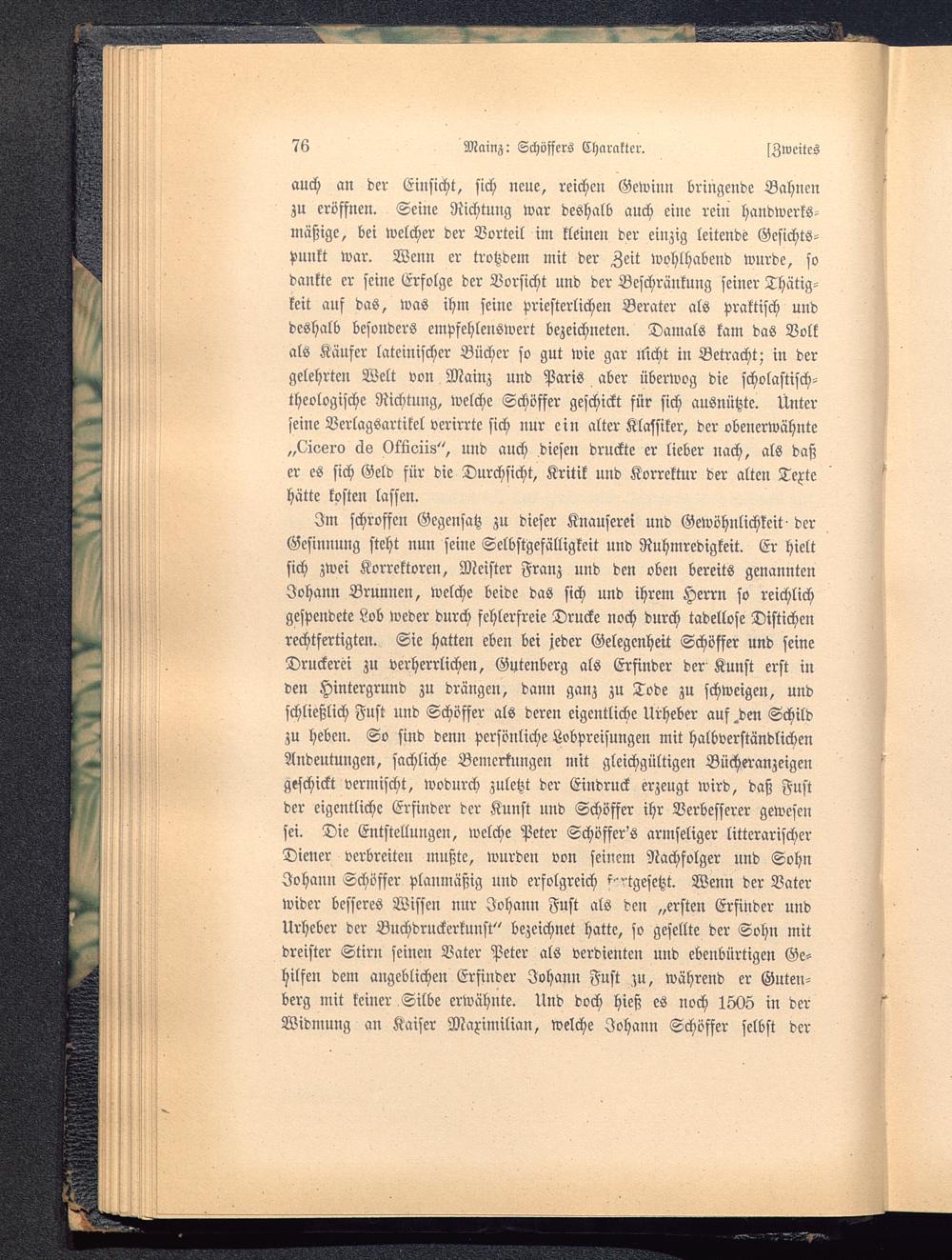 auch an der Einsicht, sich neue, reichen Gewinn bringende Bahnenzu eröffnen. Seine Richtung war deshalb auch eine rein handwerks-mäßige, bei welcher der Vorteil im kleinen der einzig leitende Gesichts-punkt war. Wenn er trotzdem mit der Zeit wohlhabend wurde, sodankte er seine Erfolge der Vorsicht und der Beschränkung seiner Thätig-keit auf das, was ihm seine priesterlichen Berater als praktisch unddeshalb besonders empfehlenswert bezeichneten. Damals kam das Volkals Käufer lateinischer Bücher so gut wie gar ilicht in Betracht; in dergelehrten Welt von Mainz und Paris aber überwog die scholastisch-theologische Richtung, welche Schöfser geschickt für sich ausnützte. Unterseine Verlagsartikel verirrte sich nur ein alter Klassiker, der obenerwähnte„Livero äs Oköoiis", und auch diesen druckte er lieber nach, als daßer es sich Geld für die Durchsicht, Kritik und Korrektur der alten Textehätte kosten lassen.