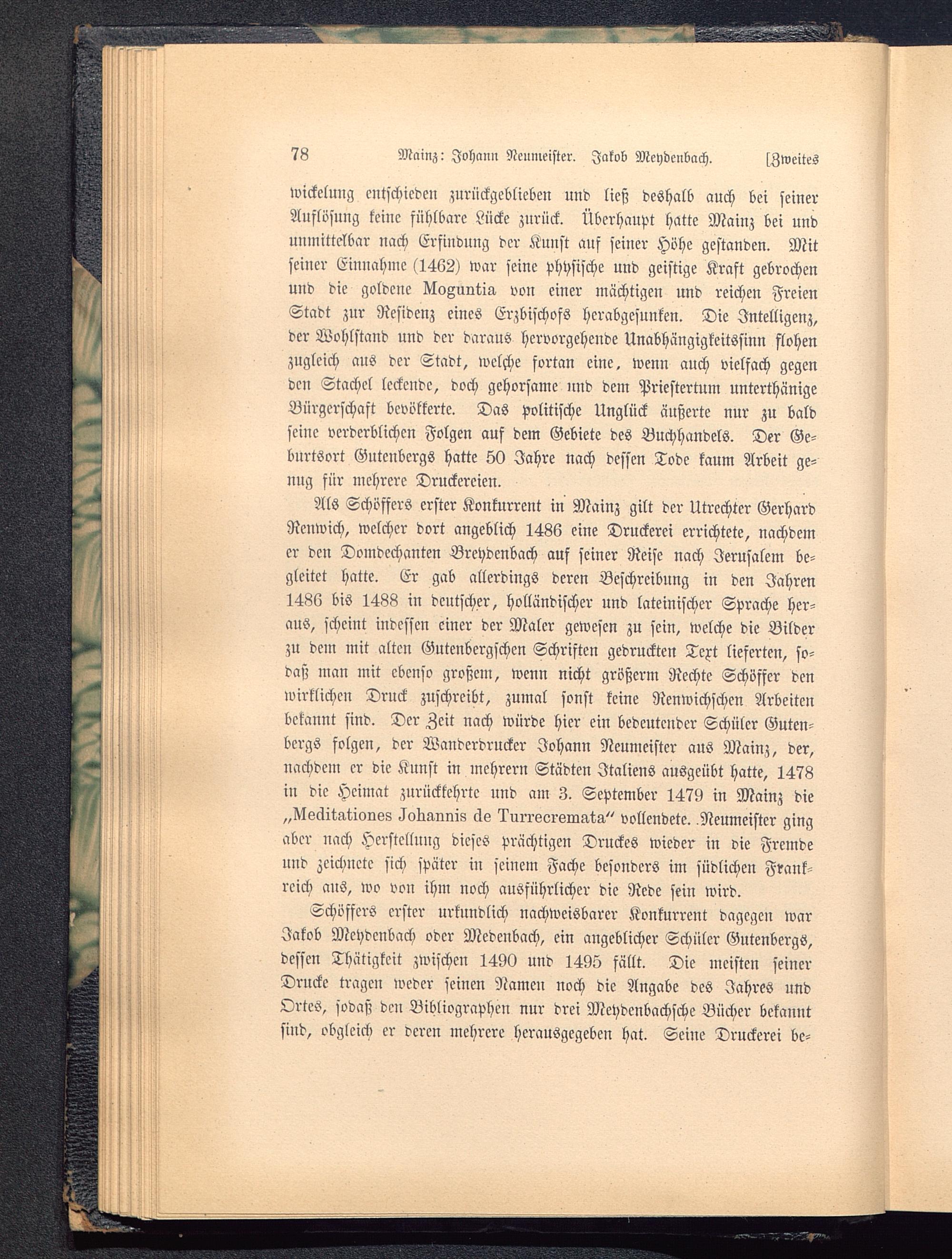 Schöffers erster urkundlich nachweisbarer Konkurrent dagegen warJakob Meydenbach oder Medenbach, ein angeblicher Schüler Gutenbergs ,dessen Thätigkeit zwischen 1490 und 1495 fällt. Die meisten seinerDrucke tragen weder seinen Namen noch die Angabe des Jahres undOrtes, sodaß den Bibliographen nur drei Meydenbachsche Bücher bekanntsind, obgleich er deren mehrere herausgegeben hat. Seine Druckerei be-
