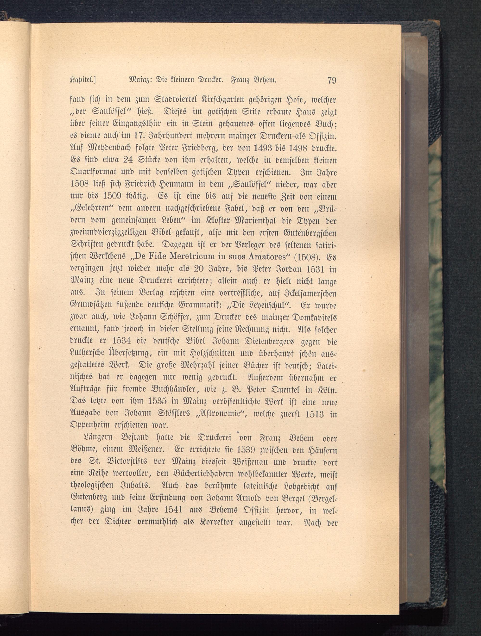 Längern Bestand hatte die Druckerei von Franz Behem oderBöhme, einem Meißener. Er errichtete sie 153!» zwischen den Häuserndes St. Victorstifts vor Mainz diesseit Weißcnau und druckte dorteine Reihe wertvoller, den Bücherlicbhabern wohlbekannter Werke, meisttheologischen Inhalts. Auch das berühmte lateinische Lobgedicht aufGutenberg und seine Erfindung von Johann Arnold von Bergel (Bergel-lanus) ging im Jahre 1541 aus Behems Ofsizin hervor, in wel-cher der Dichter vermuthlich als Korrektor angestellt war. Nach der