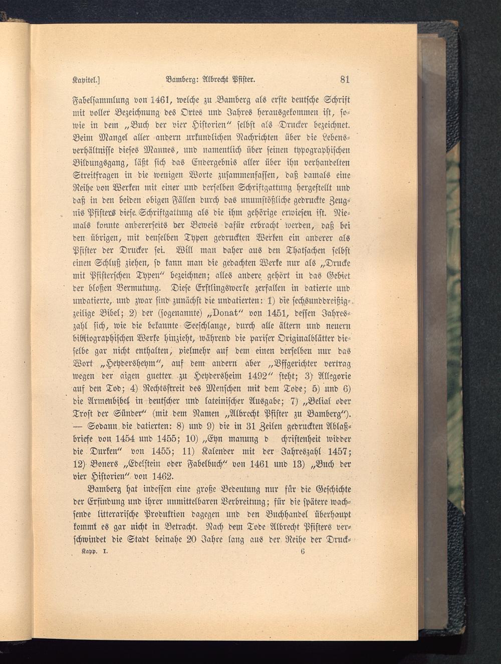 Fabelsammlung von 1461, welche zu Bamberg als erste deutsche Schriftmit voller Bezeichnung des Ortes und Jahres herausgekommen ist, so-wie in dem „Buch der vier Historien" selbst als Drucker bezeichnet.Beini Mangel aller andern urkundlichen Nachrichten über die Lebens-verhältnisse dieses Mannes, und namentlich über seinen typographischenBildungsgang, läßt sich das Endergebnis aller über ihn verhandeltenStreitfragen in die wenigen Worte zusammenfassen, daß damals eineReihe von Werken mit einer und derselben Schriftgattung hergestellt unddaß in den beiden obigen Fällen durch das unumstößliche gedruckte Zeug-nis Pfisters diese. Schriftgattung als die ihm gehörige erwiesen ist. Nie-mals konnte andererseits der Beweis dafür erbracht werden, daß beiden übrigen, mit denselben Typen gedruckten Werken ein anderer alsPfister der Drucker sei. Will man daher aus den Thatsachen selbsteinen Schluß ziehen, so kann man die gedachten Werke nur als „Druckemit Pfisterschen Typen" bezeichnen; alles andere gehört in das Gebietder bloßen Vermutung. Diese Erstlingswerke zerfallen in datierte undundatierte, und zwar sind zunächst die undatierten: 1) die sechMnddreißig-,zeilige Bibel; 2) der (sogenannte) „vons-t" von 1451, dessen Jahres-zahl sich, wie die bekannte Seeschlange, durch alle ältern und neuernbibliographischen Werke hinzieht, während die pariser Originalblätter die-selbe gar nicht enthalten, vielmehr auf dem einen derselben nur dasWort „Hehdersheym", auf dem andern aber „Vffgerichter vertragwegen der aigen guetter zu Heydersheim 1492" steht; 3) Allegorieauf den Tod; 4) Rechtsstreit des Menschen mit dem Tode; 5) und 6)die Armenbibel in deutscher und lateinischer Ausgabe; 7) „Belial oderTrost der Sünder" (mit dem Namen „Albrecht Pfister zu Bamberg ").— Sodann, die datierten: 8) und 9) die in 31 Zeilen gedruckten Ablaß-briefe von 1454 und 1455; 10) „Eyn manung d christenheit Widderdie Durken" von 1455; 11) Kalender mit der Jahreszahl 1457;12) Boners „Edelstein oder Fabelbuch" von 1461 und 13) „Buch dervier Historien" von 1462.