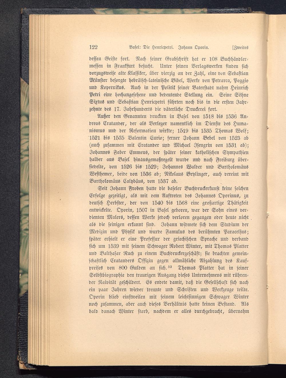 dessen Geiste fort. Nach seiner Grabschrift hat er 108 Buchhändler-messen in Frankfurt besucht. Unter seinen Verlagswerken finden sichvorzugsweise alte Klassiker, über vierzig an der Zahl, eine von SebastianMünster besorgte hebräisch-lateinische Bibel, Werke von Petrarca, Poggiound Kopernikus. Auch in der Politik seiner Baterstadt nahm HeinrichPetri eine hochangesehene und bedeutende Stellung ein. Seine SöhneSixtus und Sebastian Henricpetri führten noch bis in die ersten Jahr-zehnte des 17. Jahrhunderts die väterliche Druckerei fort.
