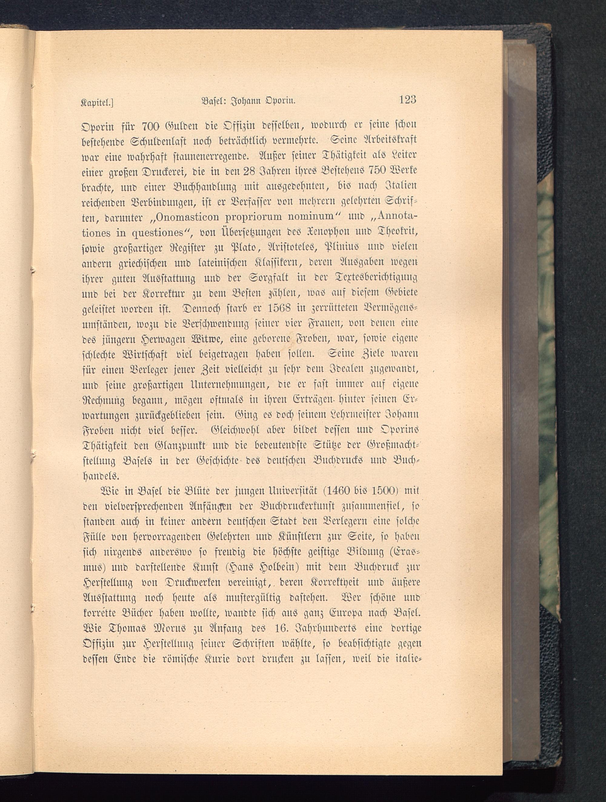 Oporin für 700 Gulden die Offizin desselben, wodurch er seine schonbestehende Schuldeulast uoch beträchtlich vermehrte. Seine Arbeitskraftwar eine wahrhaft staunenerregende. Außer seiner Thätigkeit als Leitereiner großen Druckerei, die in den 28 Iahren ihres Bestehens 750 Wertebrachte, und einer Buchhandlung mit ausgedehnten, bis nach Italien reichenden Verbinduugen, ist er Verfasser von mehreru gelehrten Schrif-ten, darunter „Onowastieon propriorura nouiinum" und „.Vnnotu.-tionss in qMstioiiW", von Übersetzungen des Xeuophon uud Thcotrit,sowie großartiger Register zu Plato, Aristoteles , Pliuius und vielenandern griechischen und lateinischen Klassikern, deren Ausgaben wegenihrer guteu Ausstattung und der Sorgfalt in der TcxtcSberichtiguugund bei der Korrektur zu dem Besten zählen, was ans diesem Gebietegeleistet wordcu ist. Dennoch starb er 1508 iu zerrütteten VcrmögenS-umstäuden, wozu die Verschwendung seiner vier Franc», von denen einedes jüngeru Herwageu Witwe, eiue geborene Froben, war, sowie eigeneschlechte Wirtschaft viel beigetragen haben sollen. Seine Ziele warenfür einen Verleger jener Zeit vielleicht zu sehr dem Idealen zugewandt,nnd seine großartigen Unternehmungen, die er fast immer auf eigeneRechnung begann, mögen oftmals in ihren Erträgen hinter seinen Er-Wartungen zurückgeblieben sein. Ging es doch seinem Lehrmeister JohannFroben nicht viel besser. Gleichwohl aber bildet dessen und OvorinSThätigkeit den Glanzpunkt und die bedeutendste Stütze der Großmacht-stellung Basels in der Geschichte- des deutschen Buchdrucks und Buch-handels .
