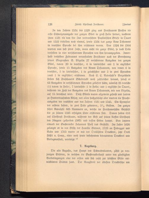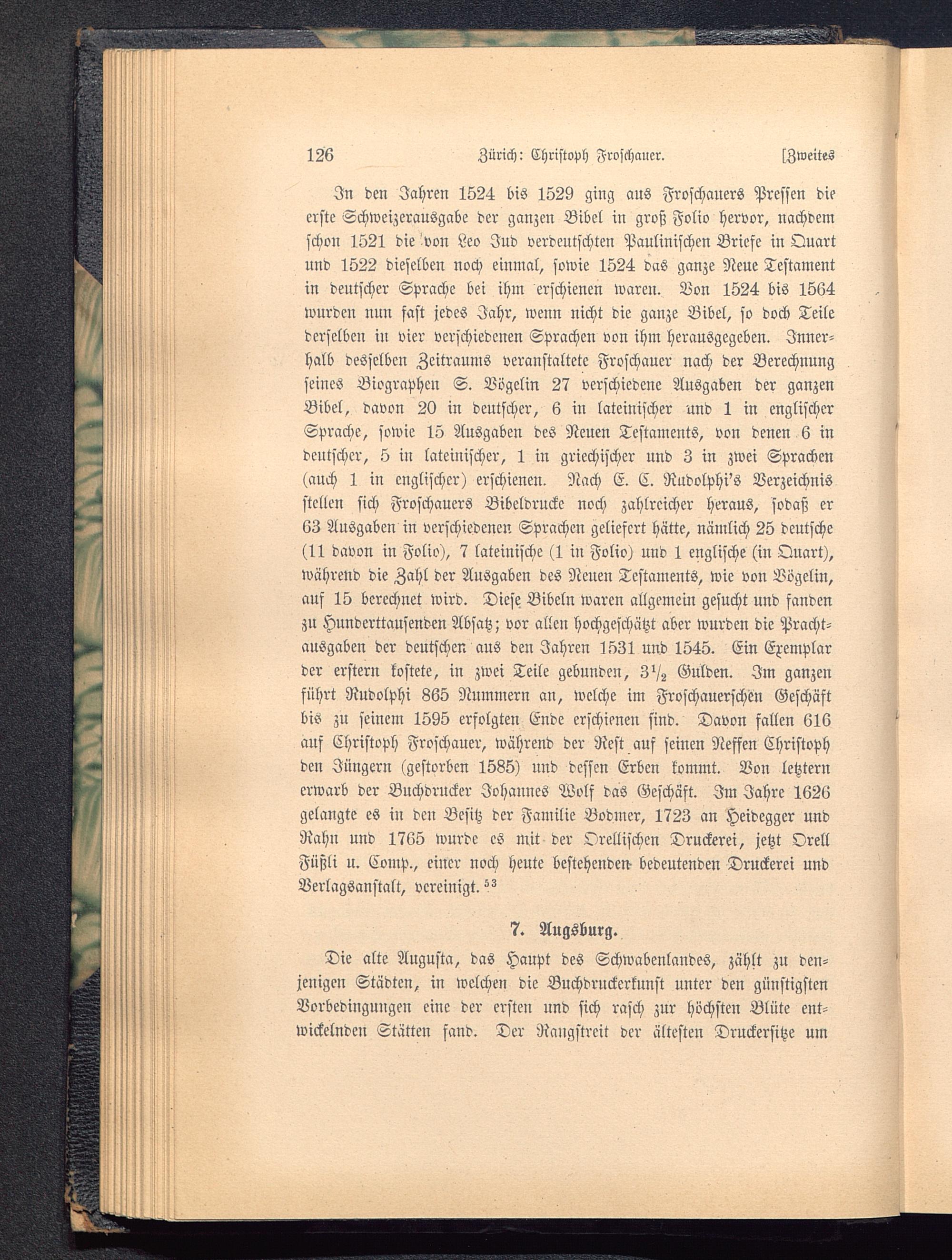 In den Jahren 1524 bis 1529 ging aus Froschauers Pressen dieerste Schweizerausgabe der ganzen Bibel in groß Folio hervor, nachdemschon 1521 die von Leo Jud verdeutschten Paulinischen Briefe in Quartund 1522 dieselben noch einmal, sowie 1524 das ganze Neue Testamentin deutscher Sprache bei ihm erschienen waren. Von 1524 bis 1564wurden uun fast jedes Jahr, wenn nicht die ganze Bibel, so doch Teilederselben in vier verschiedenen Sprachen von ihm herausgegeben. Inner-halb desselben Zeitraums veranstaltete Froschaucr nach der Berechnungseines Biographen S. Vögclin 27 verschiedene Ausgaben der ganzenBibel, davon 20 in deutscher, 6 in lateinischer und 1 in englischerSprache, sowie 15 Ausgaben des Neuen Testaments , von denen 6 indeutscher, 5 in lateinischer, 1 in griechischer und 3 in zwei Sprachen(auch 1 in englischer) erschienen. Nach E. C. Rudolphi's Verzeichnisstellen sich Froschauers Bibcldruckc noch zahlreicher heraus, sodaß er63 Ausgaben in verschiedenen Sprachen geliefert hätte, nämlich 25 deutsche (11 davon in Folio), 7 lateinische (1 in Folio) und 1 englische (in Quart),während die Zahl der Ausgaben des Neuen Testaments , wie von Vögelin,auf 15 berechnet wird. Diese Bibeln waren allgemein gesucht und fandenzn Hunderttausenden Absatz; vor allen hochgeschätzt aber wurden die Pracht-ausgaben der deutschen aus den Jahren 1531 und 1545. Ein Exemplarder ersteru kostete, in zwei Teile gebunden, 3^2 Gulden. Im ganzenführt Nudolphi 865 Nummern an, welche im Froschauerschen Geschäftbis zu seinem 1595 erfolgten Ende erschienen sind. Davon fallen 616auf Christoph Froschauer , während der Rest auf seinen Neffen Christophden Jüngern (gestorben 1585) und dessen Erben kommt. Von letzternerwarb der Buchdrucker Johannes Wolf das Geschäft. Im Jahre 1626gelangte es in den Besitz der Familie Bodmer, 1723 an Heidegger undRahn und 1765 wurde es mit der Qrellischen Druckerei, jetzt OrellFüßli u. Comp., eiuer noch heute bestehenden- bedeutenden Druckerei undVerlagsanstalt, vereinigt."