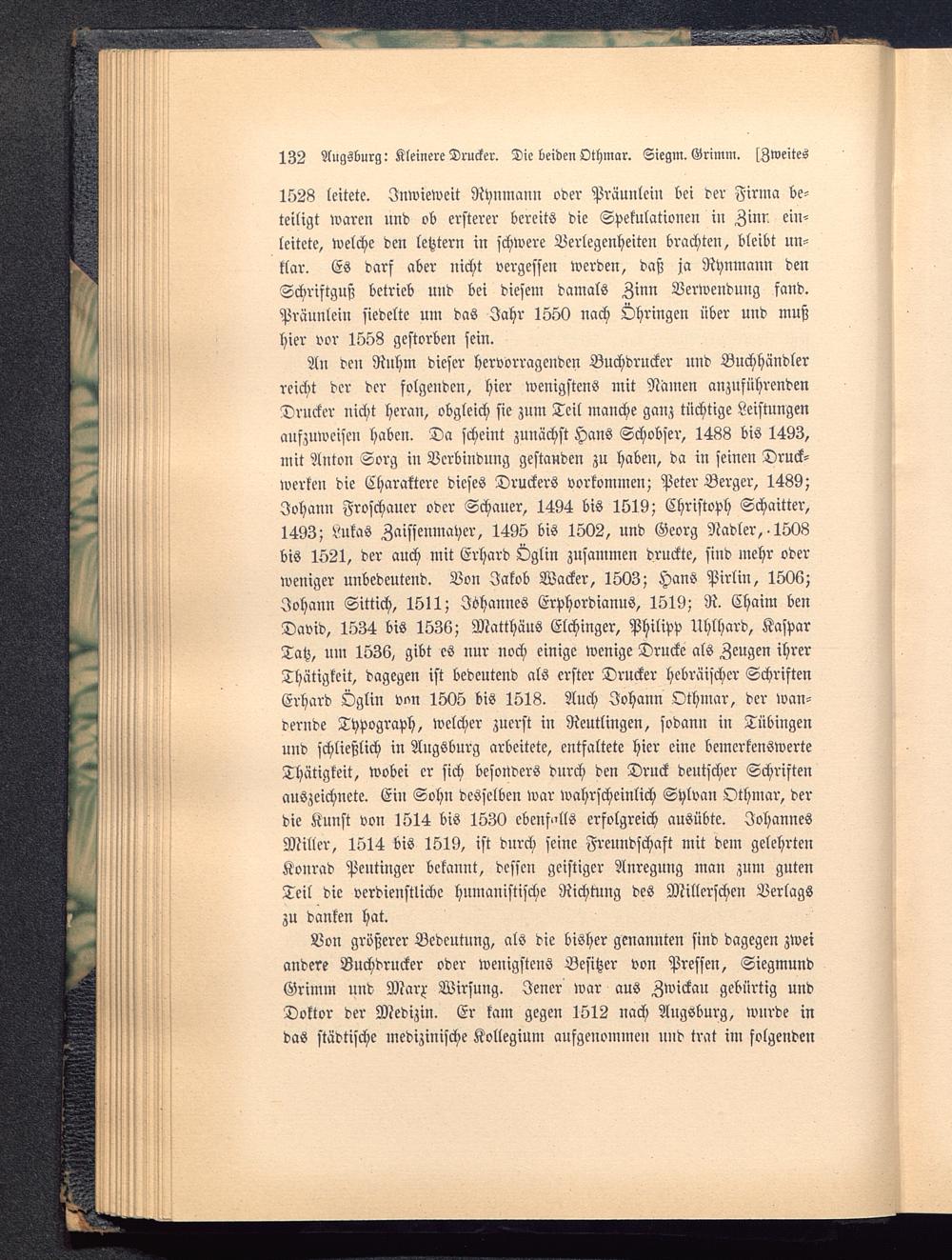 Von größerer Bedeutung, als die bisher genannten sind dagegen zweiandere Buchdrucker oder wenigstens Besitzer von Pressen, SiegmundGrimm und Marx Wirsung. Jener war aus Zwickau gebürtig undDoktor der Medizin. Er kam gegen 1512 nach Augsburg , wurde indas städtische medizinische Kollegium aufgenommen und trat im folgenden