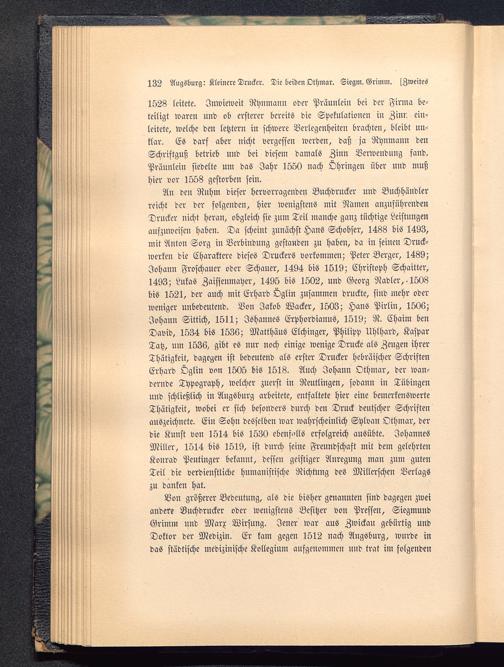 An den Ruhm dieser hervorragenden Buchdrucker und Buchhändlerreicht der der folgenden, hier wenigstens mit Namen anzuführendenDrucker nicht heran, obgleich sie zum Teil manche ganz tüchtige Leistungenaufzuweisen haben. Da scheint zunächst Hans Schobser, 1488 bis 1493,mit Auton Sorg in Verbindung gestanden zu haben, da in seinen Druck-werken die Charaktere dieses Druckers vorkommen; Peter Berger, 1489;Johann Froschauer oder Schauer, 1494 bis 1519; Christoph Schattier,1493; Lukas Zaisseumayer, 1495 bis 1502, und Georg Nadler,-1508bis 1521, der auch mit Erhard Öglin zusammen druckte, sind mehr oderweniger unbedeutend. Von Jakob Wacker, 1503; Hans Pirlin, 1506;Johann Sittich, 1511; Johannes Erphordianus, 1519; R. Chaim benDavid, 1534 bis 1536; Matthäus Elchinger, Philipp Uhlhard, KasparTatz, um 1536, gibt es nur noch einige wenige Drucke als Zeugen ihrerThätigkeit, dagegen ist bedeutend als erster Drncker hebräischer SchriftenErhard Öglin von 1505 bis 1518. Auch Johann Othmar, der wan-dernde Typograph, welcher zuerst in Reutlingen, sodann in Tübingen und schließlich in Augsburg arbeitete, entfaltete hier eine bemerkenswerteThätigkeit, wobei er sich besonders durch den Druck deutscher Schriftenauszeichnete. Ein Sohn desselben war wahrscheinlich Sylvan Othmar, derdie Kunst von 1514 bis 1530 ebenfalls erfolgreich ausübte. JohannesMiller, 1514 bis 1519, ist durch seine Freundschaft mit dem gelehrtenKonrad Peutinger bekannt, dessen geistiger Anregung man zum gutenTeil die verdienstliche humanistische Richtung des Millerschen Verlagszu danken hat.