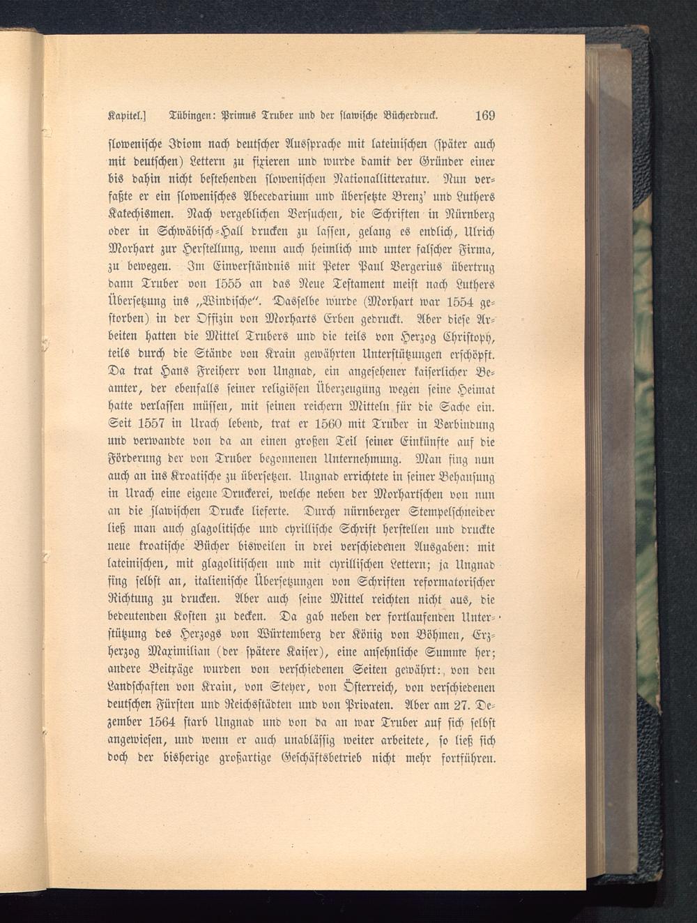 slowenische Idiom nach deutscher Aussprache mit lateinischen (später auchmit deutschen ) Lettern zu fixieren und wurde damit der Gründer einerbis dahin nicht bestehenden slowenischen Nationallitteratur. Nun ver-faßte er ein slowenisches Abecedarium und übersetzte Brenz' und Luthers Katechismen. Nach vergeblichen Versuchen, die Schriften in Nürnberg oder in Schwäbisch-Hall drucken zu lassen, gelang es endlich, UlrichMorhart zur Herstellung, wenn auch heimlich und unter falscher Firma,zu bewegen. Im Einverständnis Mit Peter Paul Vergerius übertrugdann Trüber von 1555 an das Neue Testament meist nach Luthers Übersetzung ins „Windische". Dasselbe wurde (Morhart war 1554 ge-storben) in der Offizin von Morharts Erben gedruckt. Aber diese Ar-beiten hatten die Mittel Trubers und die teils von Herzog Christoph ,teils durch die Stände von Krain gewährten Unterstützungen erschöpft.Da trat Hans Freiherr von Ungnad, ein angesehener kaiserlicher Be-amter, der ebenfalls seiner religiösen Überzeugung wegen seine Heimathatte verlassen müssen, mit seinen reichern Mitteln für die Sache ein.Seit 1557 in Urach lebend, trat er 1560 mit Trüber in Verbindungund verwandte von da an einen großen Teil seiner Einkünfte auf dieFörderung der von Trüber begonnenen Unternehmung. Man fing nunauch an ins Kroatische zu übersetzen. Ungnad errichtete in seiner Behausungin Urach eine eigene Druckerei, welche neben der Morhartschen von nunan die slawischen Drucke lieferte. Durch nürnberger Stempelschneiderließ man auch glagolitische und cyrillische Schrift herstellen und druckteueue kroatische Bücher bisweilen in drei verschiedenen Ausgaben: mitlateinischen, mit glagolitischen und mit cyrillischen Lettern; ja Ungnad fing selbst an, italienische Übersetzungen von Schriften reformatorischerRichtung zu drucken. Aber auch seine Mittel reichten nicht aus, diebedeutenden Kosten zu decken. Da gab neben der fortlaufenden Unter-stützung des Herzogs von Würtemberg der König von Böhmen , Erz-herzog Maximilian (der spätere Kaiser), eine ansehnliche Summe her;andere Beiträge wurden von verschiedenen Seiten gewährt:, von denLandschaften von Kram, von Steher, von Österreich , von verschiedenendeutschen Fürsten und Reichsstädten und von Privaten. Aber am 27. De-zember 1564 starb Ungnad und von da an war Trüber auf sich selbstangewiesen, und wenn er auch unablässig weiter arbeitete, so ließ sichdoch der bisherige großartige Geschäftsbetrieb nicht mehr fortführen.