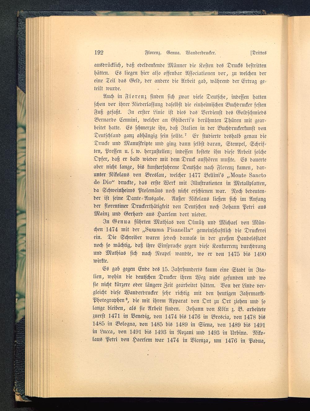 Auch in Florenz finden sich zwar viele Deutsche, indessen hattenschon vor ihrer Niederlassung daselbst die einheimischen Buchdrucker festenFuß gefaßt. In erster Linie ist dies das Verdienst des GoldschmiedsBernardo Cennini , welcher an Ghibcrti's berühmten Thüren mit gear-beitet hatte. Es schmerzte ihn, daß Italien in der Buchdruckerkunst vonDeutschland ganz abhängig sein sollte.? Er studierte deshalb genau dieDrucke und Manuskripte und ging dann selbst daran, Stempel, Schrif-ten, Pressen u. s. w. herzustellen; indessen kostete ihn diese Arbeit solcheOpfer, daß er bald wieder mit dem Druck aufhören mußte. Es dauerteaber nicht lange, bis kunsterfahrene Deutsche nach Florenz kamen, dar-unter Nikolaus von Breslau, welcher 1477 Bellini's „Ncmtk Sanoto66 vio" druckte, das erste Werk mit Illustrationen in Metallplatten,da Schweinheims Ptolemäus noch nicht erschienen war. Noch bedeuten-der ist seine Dante-Ausgabe. Außer Nikolaus ließen sich im Anfangder slorentiner Druckerthätigkeit von Deutschen noch Johann Petri ausMainz und Gerhard aus Haerlem dort nieder.